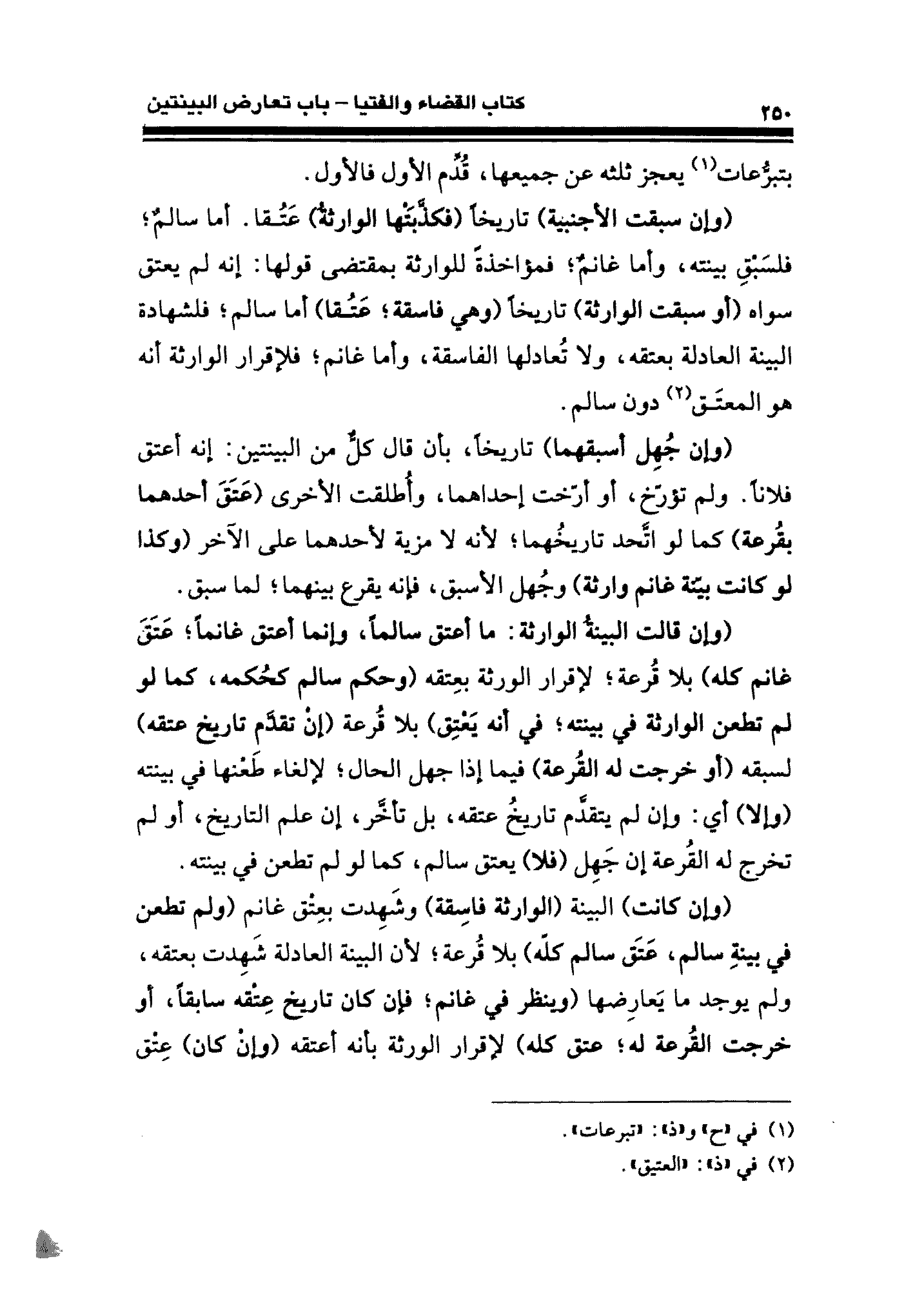 (وإن قالت البينةُ الوارثة: ما أعتق سالمًا، وإنما أعتق غانمًا؛ عَتَقَ غانم كله) بلا قُرعة؛ لإقرار الورثة بعِتقه (وحكم سالم كحُكمه، كما لو لم تطعن الوارثة في بينته؛ في أنه يَعْتِق) بلا قُرعة (إنْ تقدَّم تاريخ عتقه) لسبقه (أو خرجت له القُرعة) فيما إذا جهل الحال؛ لإلغاء طَعْنها في بينته (وإلا) أي: وإن لم يتقدَّم تاريخُ عتقه، بل تأخَّر، إن علم التاريخ، أو لم تخرج له القُرعة إن جَهِل (فلا) يعتق سالم، كما لو لم تطعن في بينته.