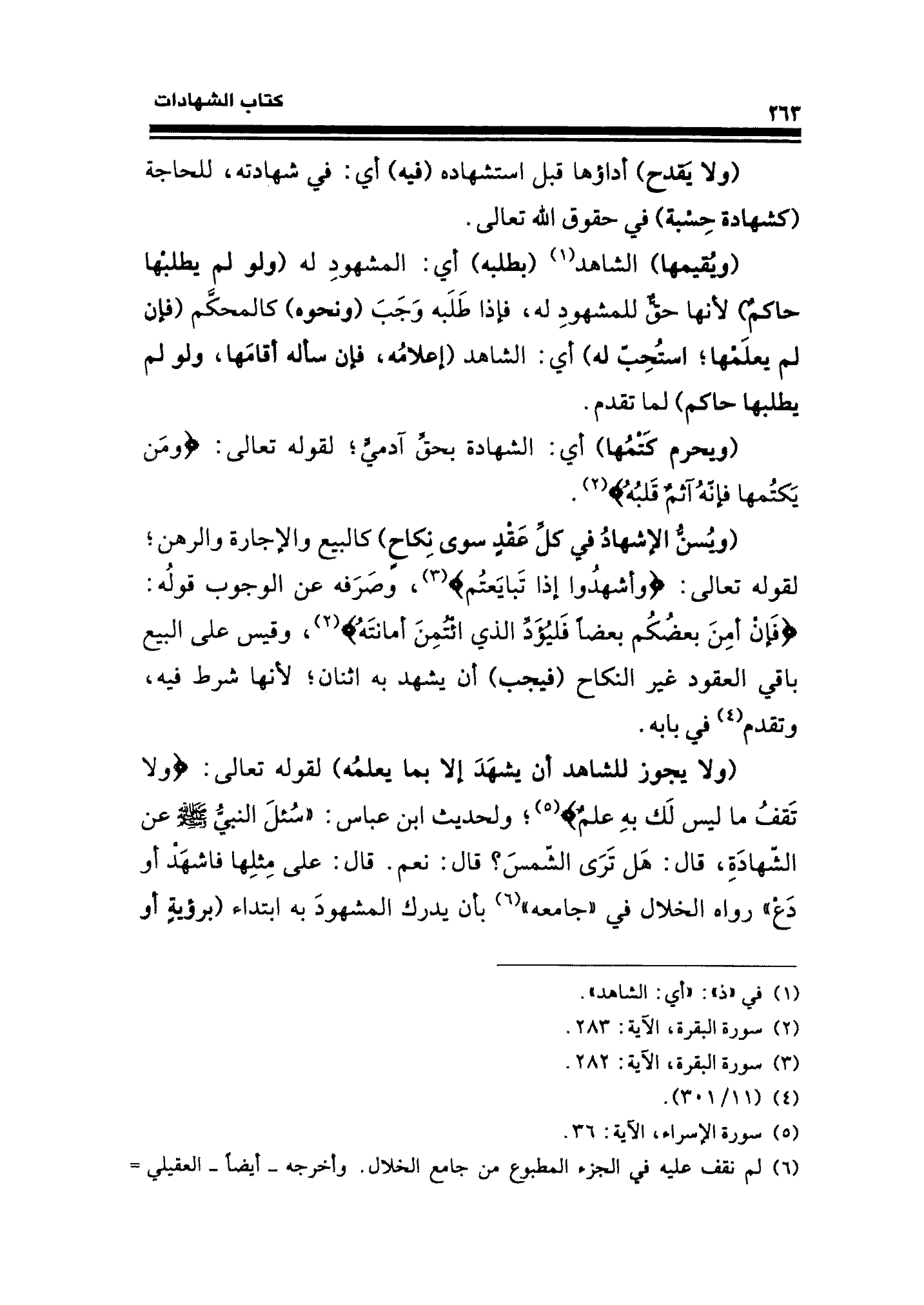 (ولا يجوز للشاهد أن يشهَدَ إلا بما يعلمُه) لقوله تعالى: {وَلَا تَقْفُ مَا لَيْسَ لَكَ بِهِ عِلْمٌ} (¬٥)؛ ولحديث ابن عباس: "سُئلَ النبيُّ - صلى الله عليه وسلم - عن الشّهادَةِ، قال: هَل تَرَى الشّمسَ؟ قال: نعم. قال: على مِثلِها فاشهَدْ أو دَعْ" رواه الخلال في "جامعه" (¬٦) بأن يدرك المشهودَ به ابتداء (برؤية أو