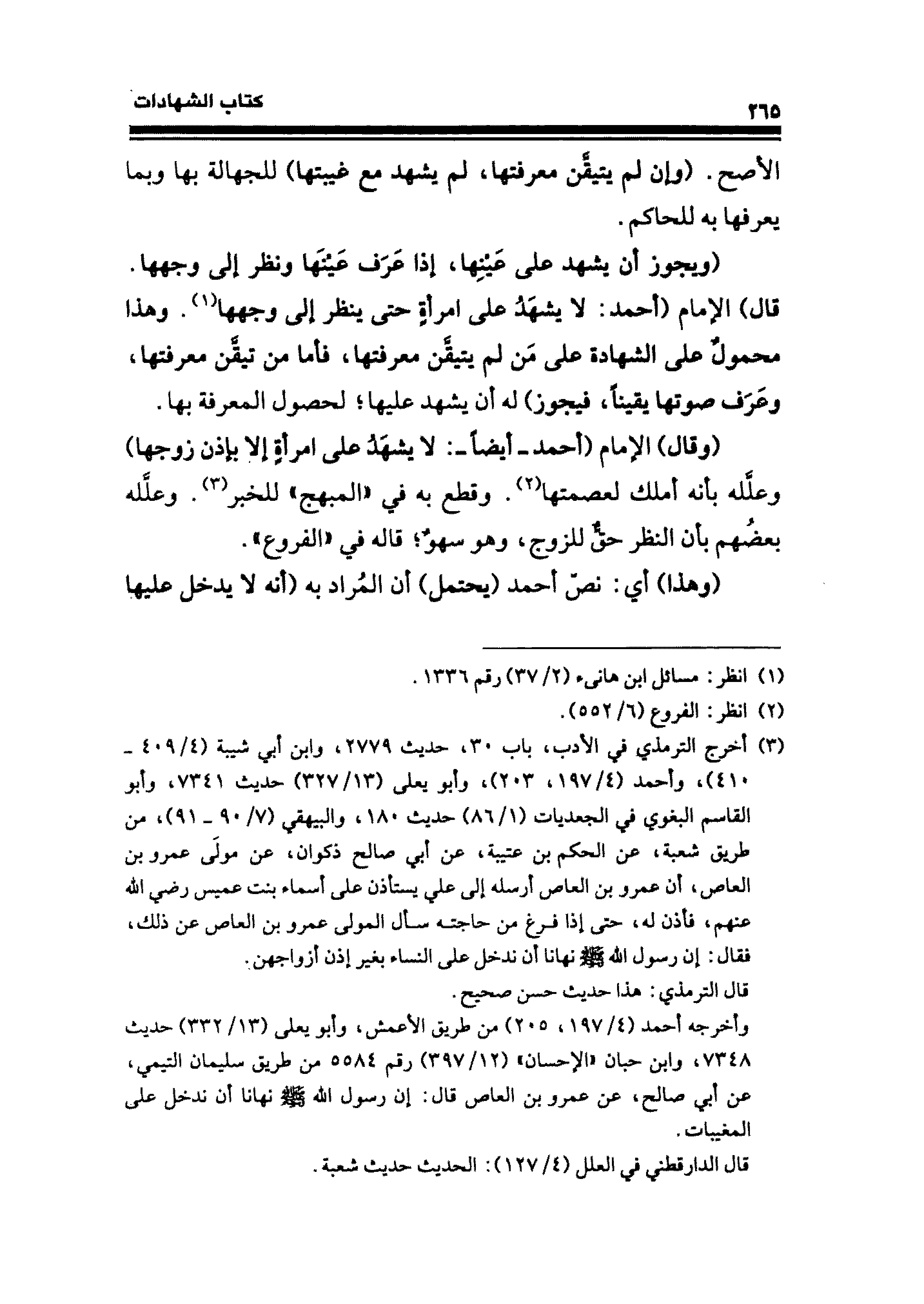 (وقال) الإمام (أحمد -أيضًا-: لا يشهَدُ على امرأةٍ إلا بإذن زوجها) وعلَّله بأنه أملك لعصمتها (¬٢). وقطع به في "المبهج" للخبر (¬٣). وعلَّله بعضُهم بأن النظر حقٌّ للزوج، وهو سهوٌ؛ قاله في "الفروع".