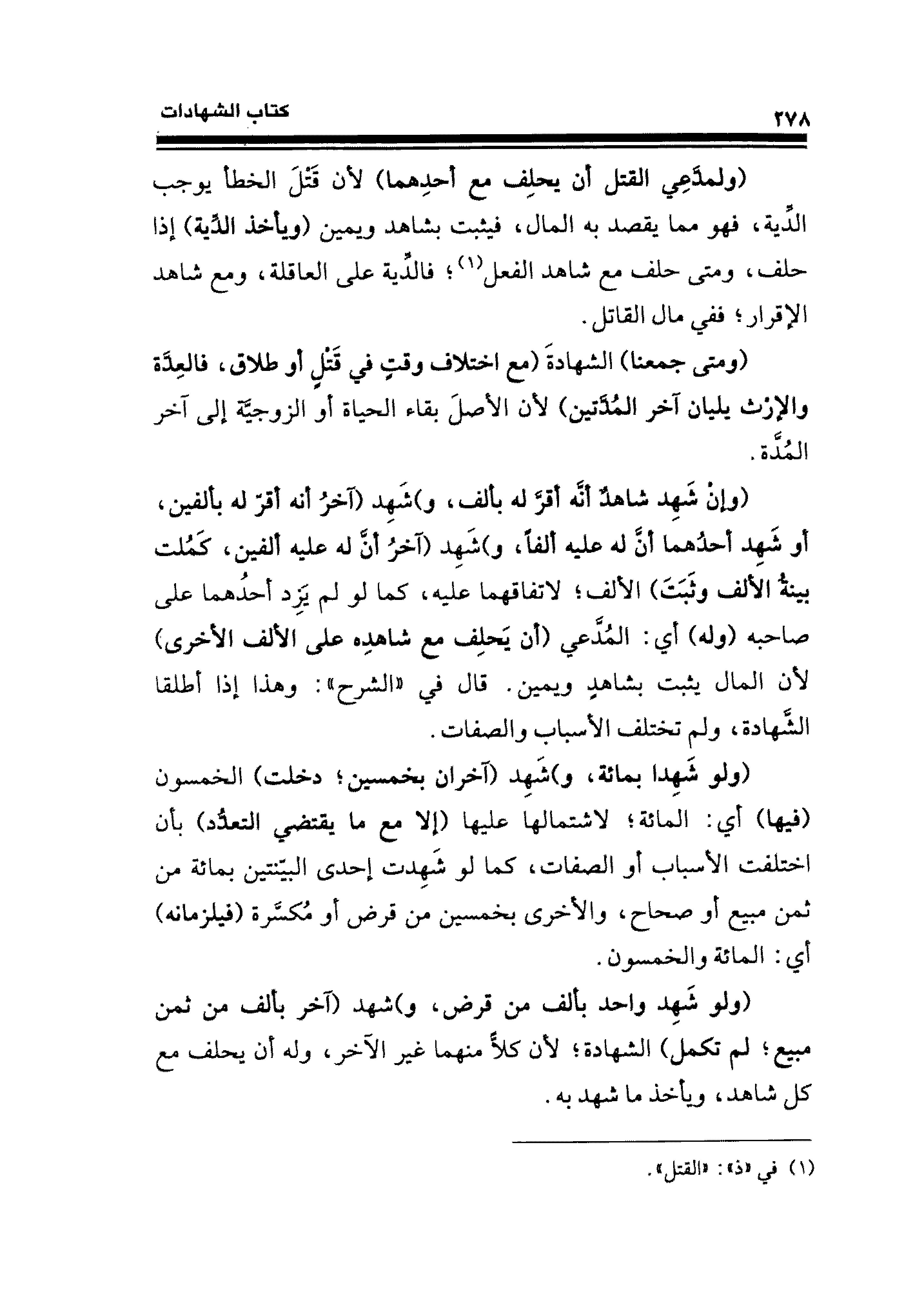 (ولو شَهِدا بمائة، و) شَهِد (آخران بخمسين؛ دخلت) الخمسون (فيها) أي: المائة؛ لاشتمالها عليها (إلا مع ما يقتضي التعدُّد) بأن اختلفت الأسباب أو الصفات، كما لو شَهِدت إحدى البيّنتين بمائة من ثمن مبيع أو صحاح، والأخرى بخمسين من قرض أو مُكسَّرة (فيلزمانه) أي: المائة والخمسون.