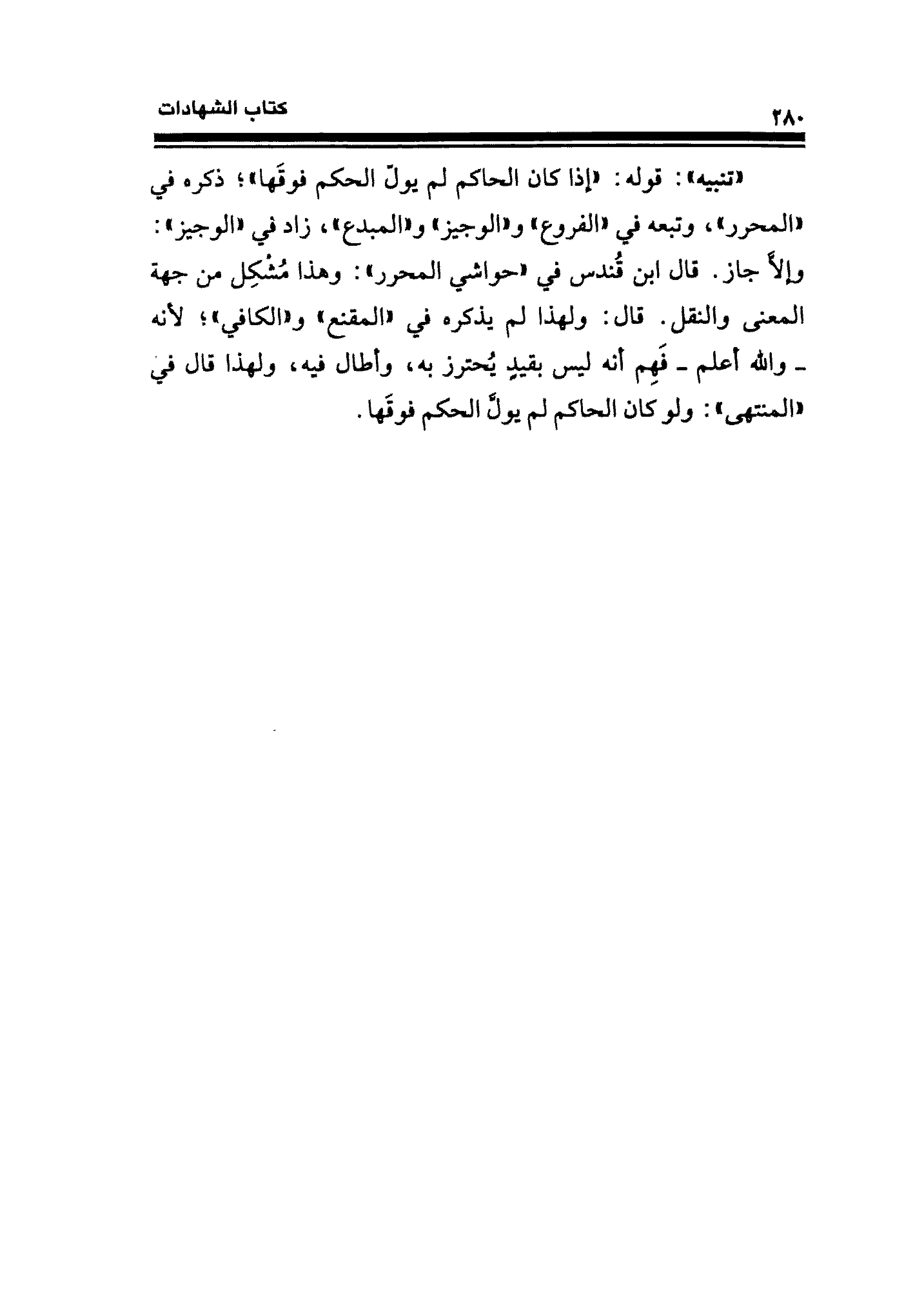 "تنبيه": قوله: "إذا كان الحاكم لم يولّ الحكم فوقَها"؛ ذكره فِي "المحرر" وتبعه في "الفروع" و"الوجيز" و"المبدع" زاد فِي "الوجيز": وإلَّا جاز. قال ابن قُندس فِي "حواشي المحرر": وهذا مُشْكِل من جهة المعنى والنقل. قال: ولهذا لم يذكره فِي "المقنع" و"الكافي"؛ لأنه -والله أعلم- فَهِم أنَّه ليس بقيدٍ يُحترز به، وأطال فيه، ولهذا قال فِي "المنتهى": ولو كان الحاكم لم يولَّ الحكم فوقَها.