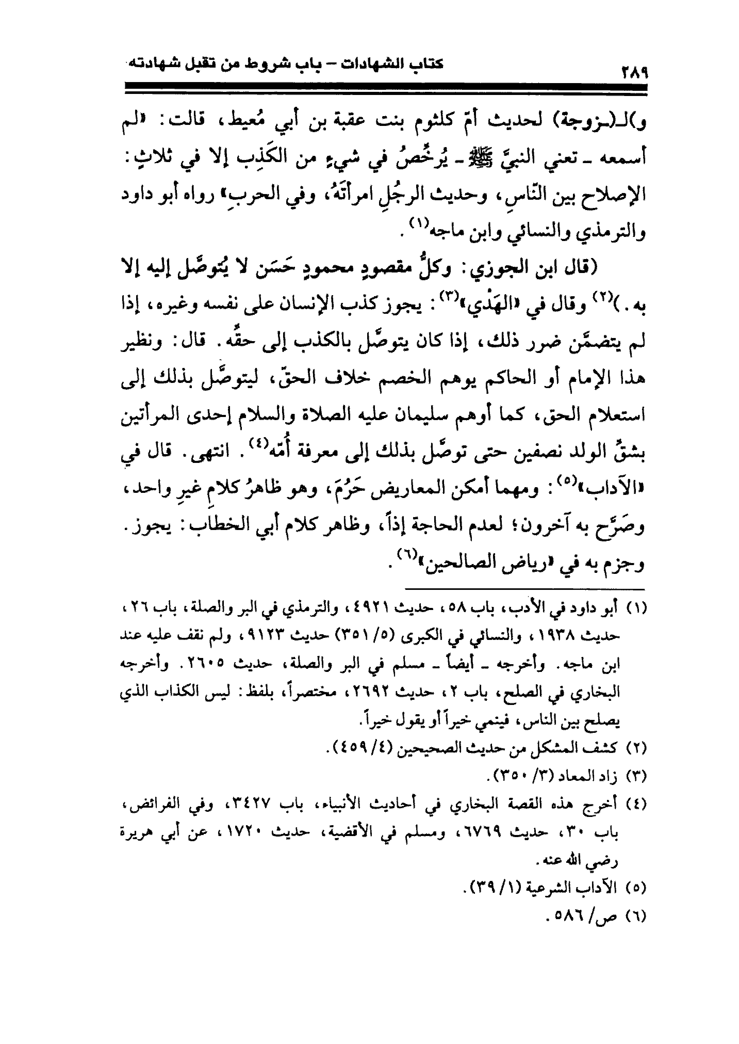 (قال ابن الجوزي: وكلُّ مقصودٍ محمودٍ حَسَن لا يُتوصَّل إليه إلا به.) (¬٢) وقال في "الهَدْي" (¬٣): يجوز كذب الإنسان على نفسه وغيره، إذا لم يتضمَّن ضرر ذلك، إذا كان يتوصَّل بالكذب إلى حقِّه قال: ونظير هذا الإِمام أو الحاكم يوهم الخصم خلاف الحق، ليتوصَّل بذلك إلى استعلام الحق، كما أوهم سيمان عليه الصلاة والسلام إحدى المرأتين بشقِّ الولد نصفين حتى توصَّل بذلك إلى معرفة أُمّة (¬٤). انتهى. قال في "الآداب" (¬٥): ومهما أمكن المعاريض حَرُمَ، وهو ظاهرُ كلامِ غيرِ واحد، وصَرَّح به آخرون؛ لعدم الحاجة إذًا، رظاهر كلام أبي الخطاب: يجوز. وجزم به في "رياض الصالحين" (¬٦).