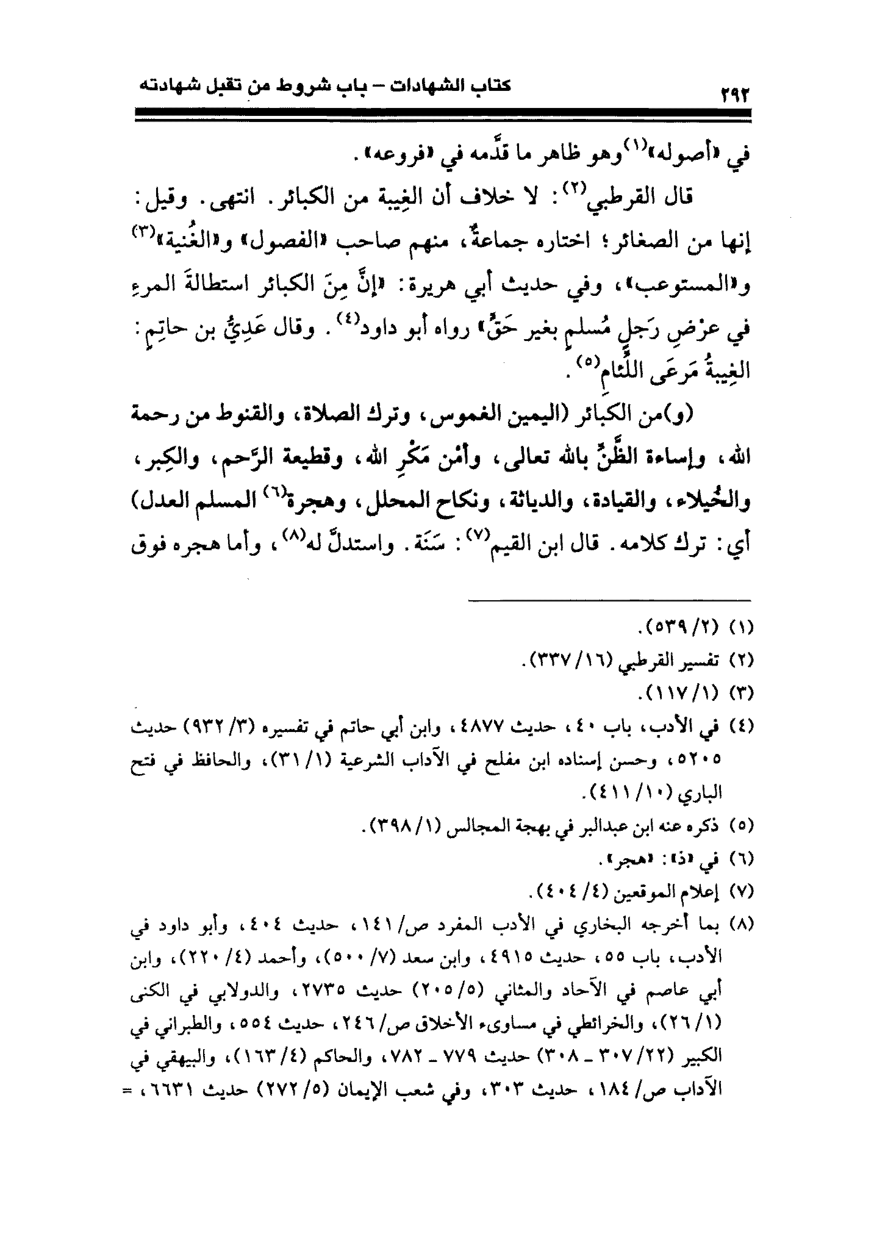 قال القرطبي (¬٢): لا خلاف أن الغِيبة من الكبائر. انتهى. وقيل: إنها من الصغائر؛ اختاره جماعةٌ، منهم صاحب "الفصول" و "الغُنية" (¬٣) و "المستوعب"، وفي حديث أبي هريرة: "إن مِنَ الكبائر استطالةَ المرءِ في عرضِ رَجلٍ مُسلمٍ بغير حَقٍّ" رواه أبو داود (¬٤). وقال عَدِىُّ بن حاتِمٍ: الغِيبةُ مَرعَى اللِّئامِ (¬٥).