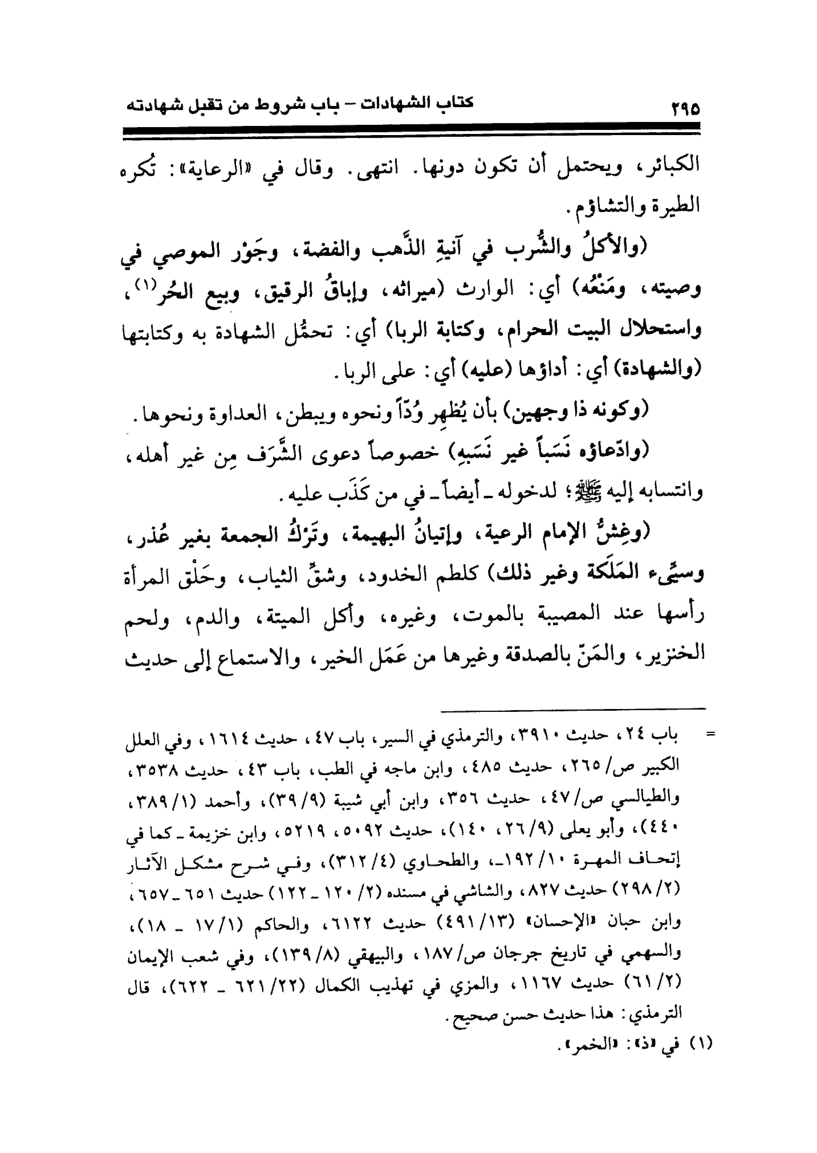 (والأكلُ والشُّرب في آنيةِ الذهب والفضة، وجَور الموصي في وصيته، ومَنْعُه) أي: الوارث (ميراثه، وإباقُ الرقيق، وبيع الحُر (¬١)، واستحلال البيت الحرام، وكتابة الربا) أي: تحمُّل الشهادة به وكتابتها (والشهادة) أي: أداؤها (عليه) أي: على الربا.