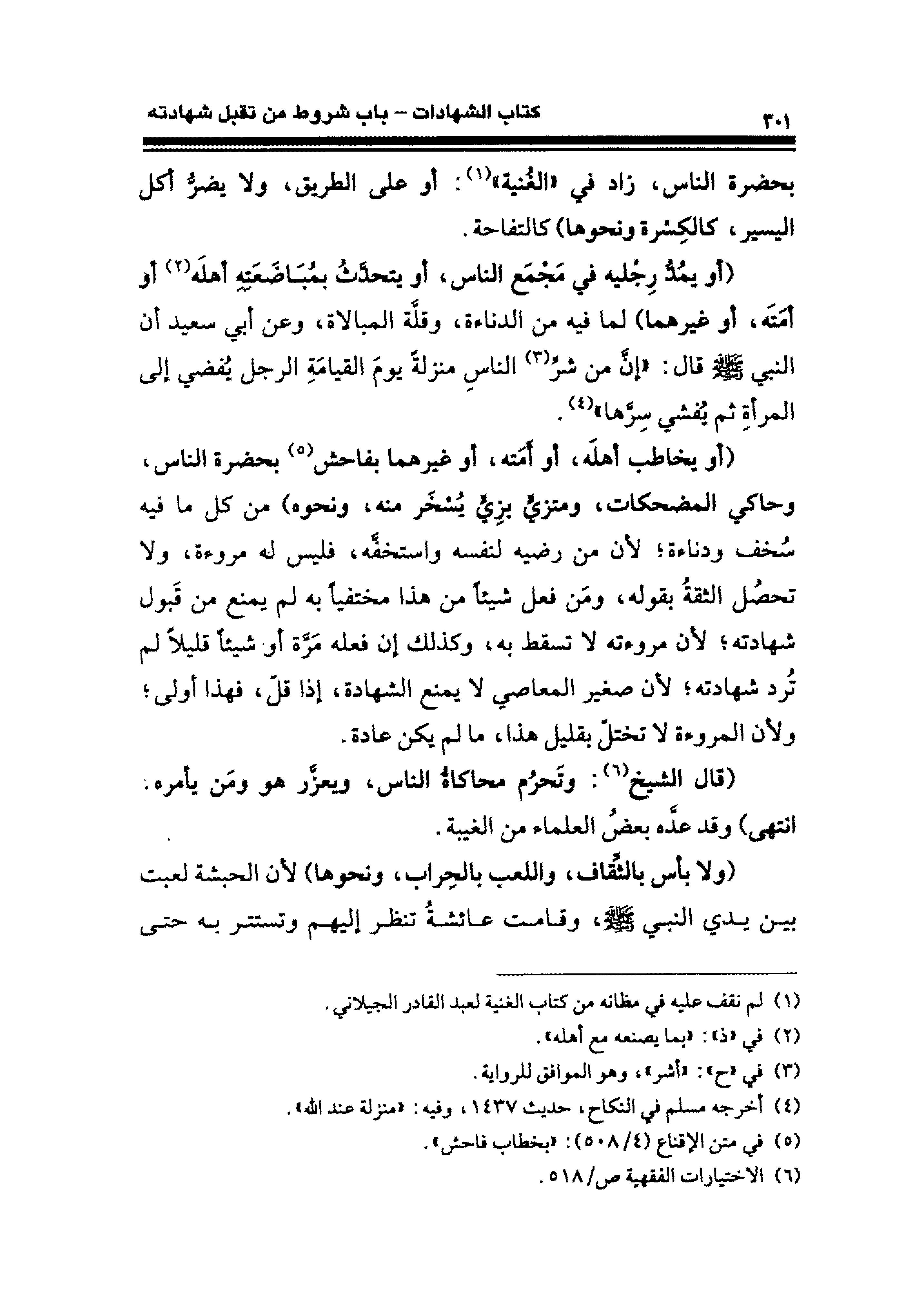 (أو يمدُّ رِجْليه في مَجْمَع الناس، أو يتحدَّث بمُبَاضَعَتِهِ أهلَه (¬٢) أو أمتَه، أو غيرهما) لما فيه من الدناءة، وقلَّة المبالاة، وعن أبي سعيد أن النبي - صلى الله عليه وسلم - قال: "إن من شرِّ (¬٣) الناسِ منزلةً يومَ القيامَةِ الرجل يُفضي إلى المرأةِ ثم يُفشي سِرَّها" (¬٤).