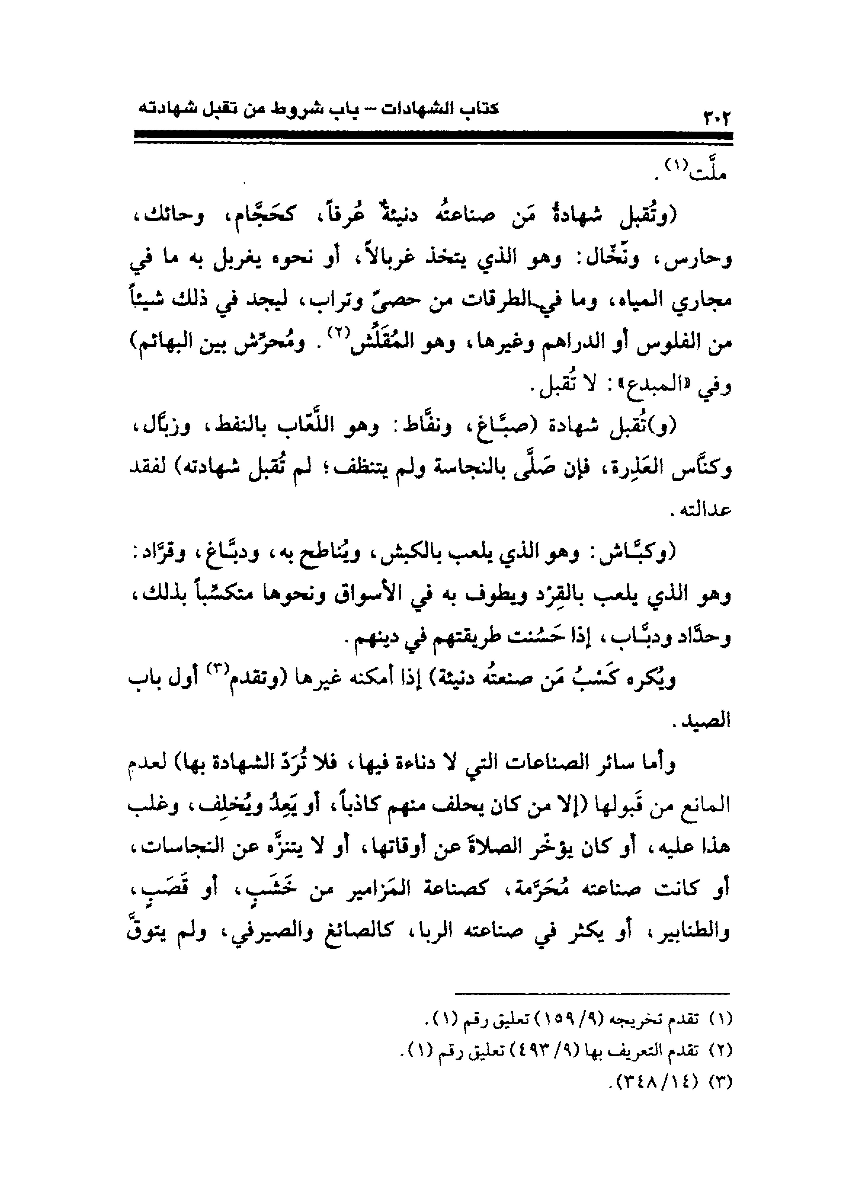 (وتُقبل شهادةٌ مَن صناعتُه دنيئةٌ عُرفًا، كحَجَّام، وحائك، وحارس، ونّخّال: وهو الذي يتخذ غربالًا، أو نحوه يغربل به ما في مجاري المياه، وما في الطرقات من حصىً وتراب، لبجد في ذلك شيئًا من الفلوس أو الدراهم وغيرها، وهو المُقَلِّش (¬٢). ومُحرِّش بين البهائم) وفي "المبدع": لا تُقبل.