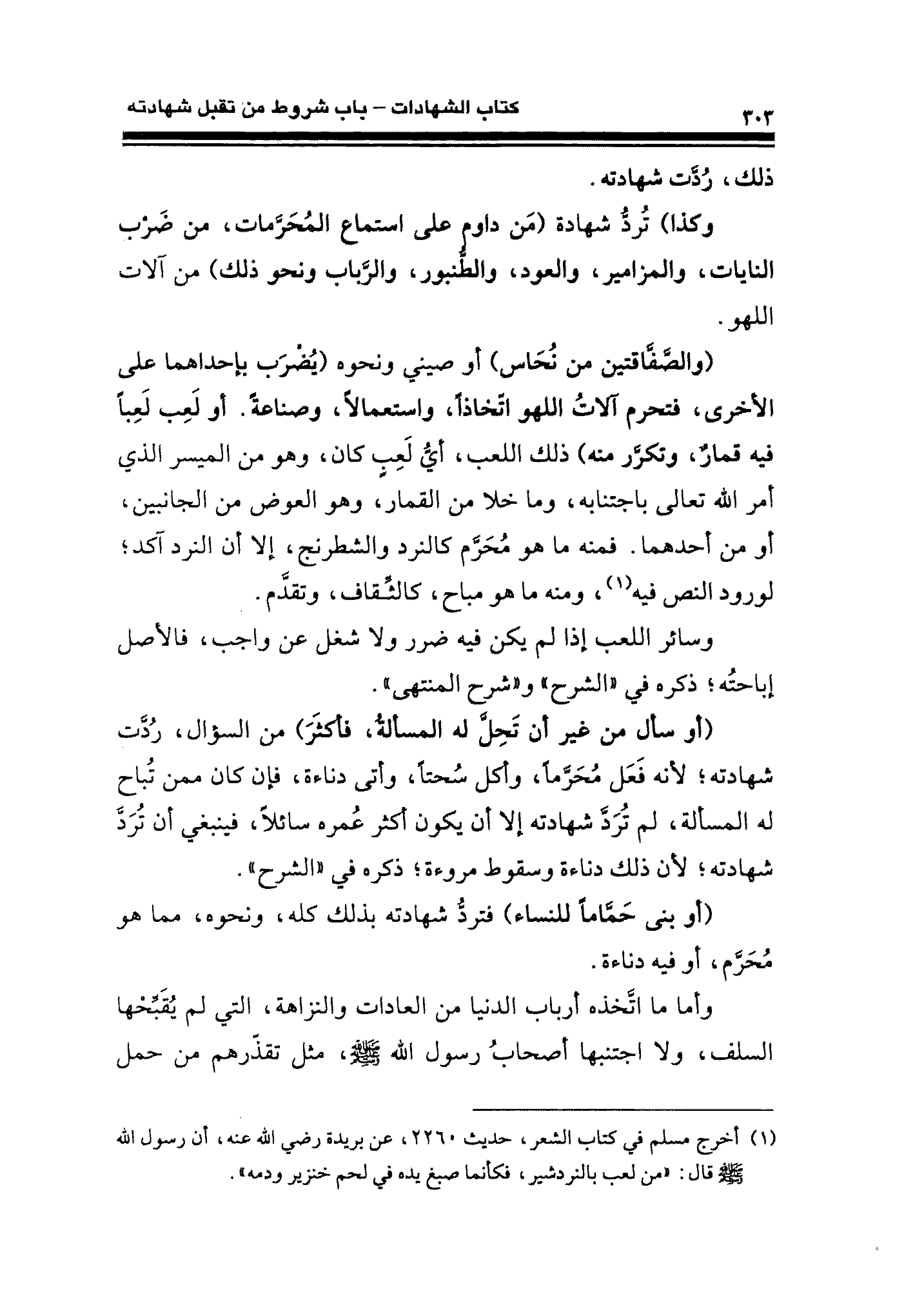 (والصَّفَّاقتين من نُحَاس) أو صيني ونحوه (يُضرَب بإحداهما على الأخرى، فتحرم آلاتُ اللهو اتّخاذًا، واستعمالًا، وصناعةً. أو لَعِب لَعِبًا فيه قمارٌ، وتكرَّر منه) ذلك اللعب، أيُّ لَعِبٍ كان، وهو من الميسر الذي أمر الله تعالى باجتنابه، وما خلا من القمار، وهو العوض من الجانبين، أو من أحدهما. فمنه ما هو مُحَرَّم كالنرد والشطرنج، إلا أن النرد آكد؛ لورود النص فيه (¬١)، ومنه ما هو مباح، كالثِّقات، وتقدَّم.