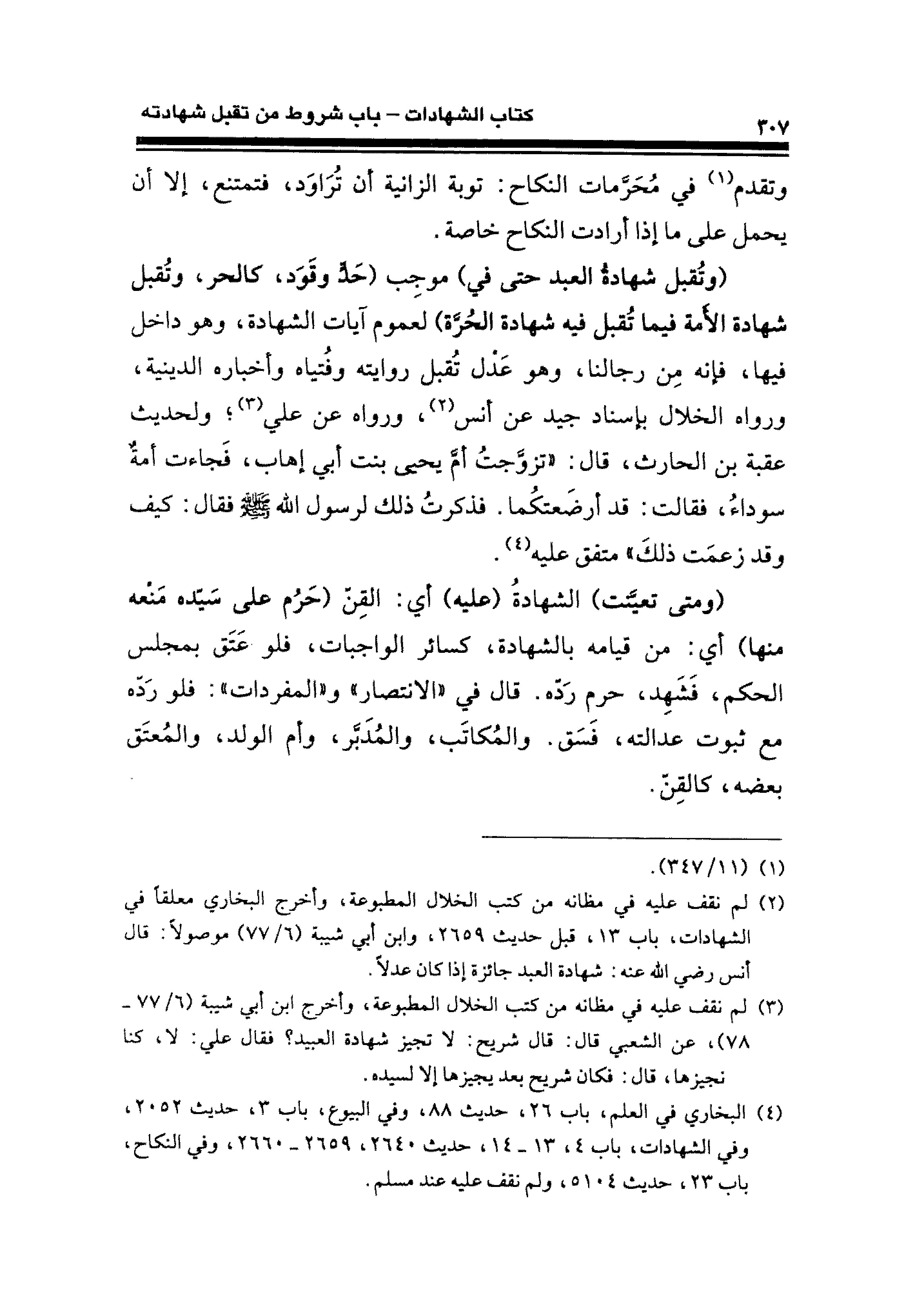 (وتُقبل شهادةُ العبد حتى في) موجِب (حَدِّ وقَوَد، كالحر، وتُقبل شهادة الأَمة فيما تُقبل فيه شهادة الحُرَّة) لعموم آيات الشهادة، وهو داخل فيها، فإنه مِن رجالنا، وهو عَدْل تُقبل روايته وفُتياه وأخباره الدينية، ورواه الخلال بإسناد جيد عن أنس (¬٢)، ورواه عن علي (¬٣)؛ ولحديث عقبة بن الحارث، قال: "تزوَّجتُ أمَّ يحيى بنت أبي إهاب، فَجاءت أمةٌ سوداءُ، فقالت: قد أرضَعتكُما. فذكرتُ ذلك لرسول الله - صلى الله عليه وسلم - فقال: كيف وقد زعمَت ذلكَ" متفق عليه (¬٤).
