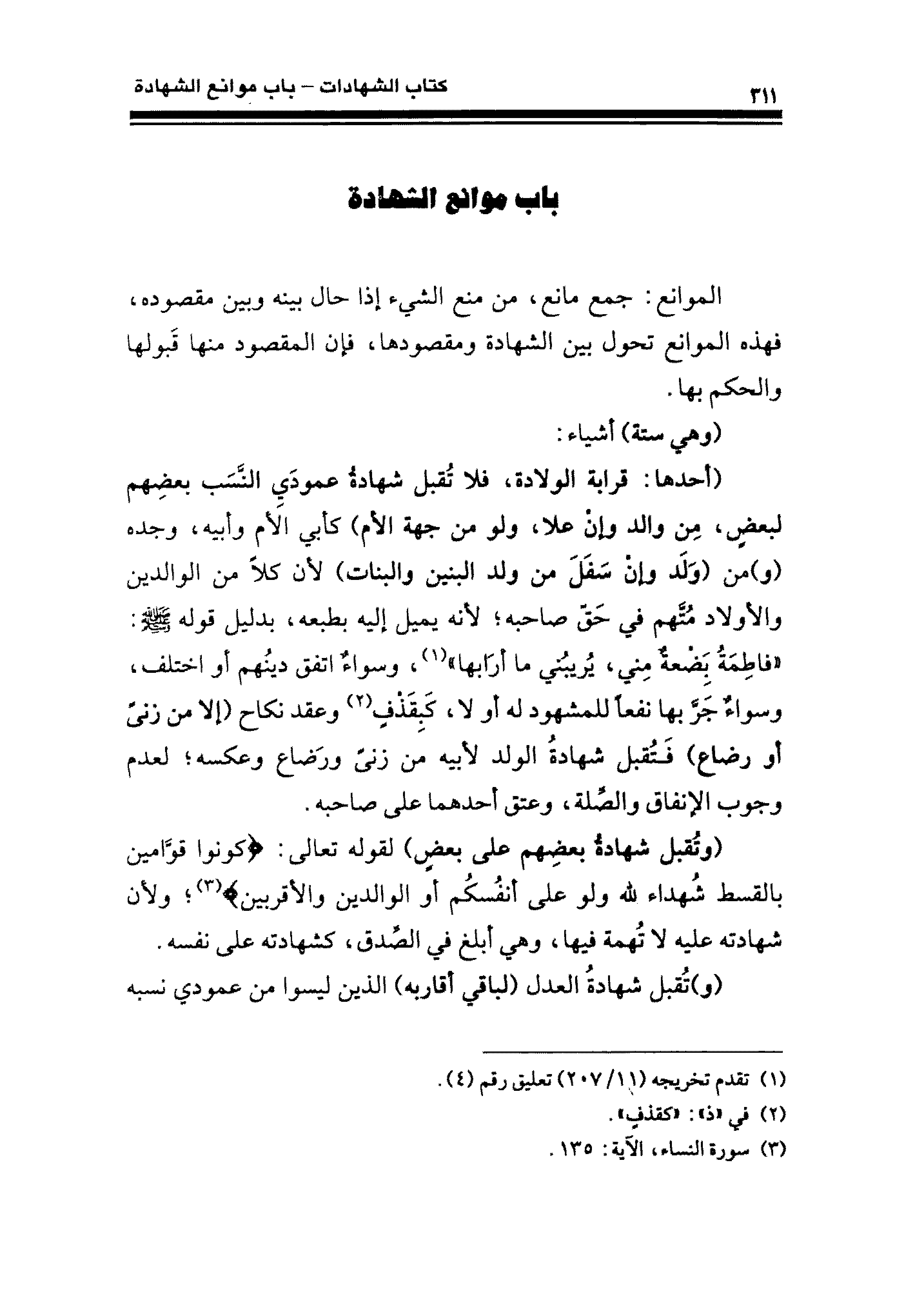 (أحدها: قرابة الولادة، فلا تُقبل شهادةُ عمودَيِ النَّسَب بعضِهم لبعضٍ، مِن والد وإنْ علا، ولو من جهة الأم) كأبي الأم وأبيه، وجده (و) من (وَلَد وان سَفَلَ من ولد البنين والبنات) لأن كلًا من الوالدين والأولاد مُتَّهم في حَقّ صاحبه؛ لأنه يميل إليه بطبعه، بدليل قوله - صلى الله عليه وسلم -: "فاطِمَةُ بَضْعةٌ مِني، يُريبُني ما أرَابها" (¬١)، وسواءٌ اتفق دينُهم أو اختلف، وسواءٌ جَرَّ بها نفعًا للمشهود له أو لا، كَبِقَذْفٍ (¬٢) وعقد نكاح (إلا من زنًى أو رضاع) فَتُقبل شهادةُ الولد لأبيه من زنًى ورَضاع وعكسه؛ لعدم وجوب الإنفاق والصِّلة، وعتق أحدهما على صاحبه.