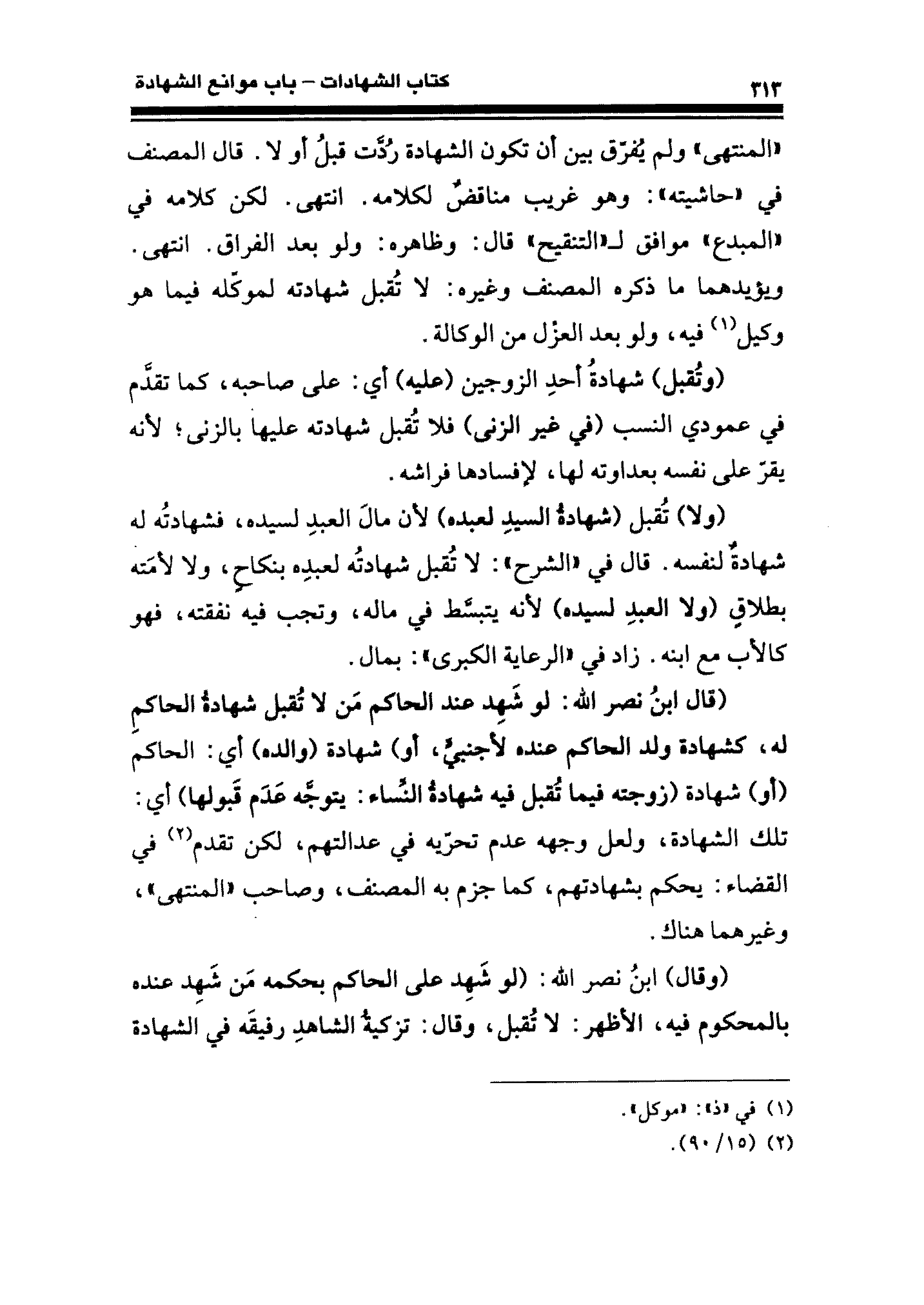 "المنتهى" ولم يُفرّق بين أن تكون الشهادة رُدَّت قبلُ أو لا. قال المصنف في "حاشيتة": وهو غريب مناقضٌ لكلامه. انتهى. لكن كلامه في "المبدع" موافق لـ "التنقيح" قال: وظاهره: ولو بعد الفراق. انتهى. ويؤيدهما ما ذكره المصنف وغيره: لا تُقبل شهادته لموكّله فيما هو وكيل (¬١) فيه، ولو بعد العزل من الوكالة.