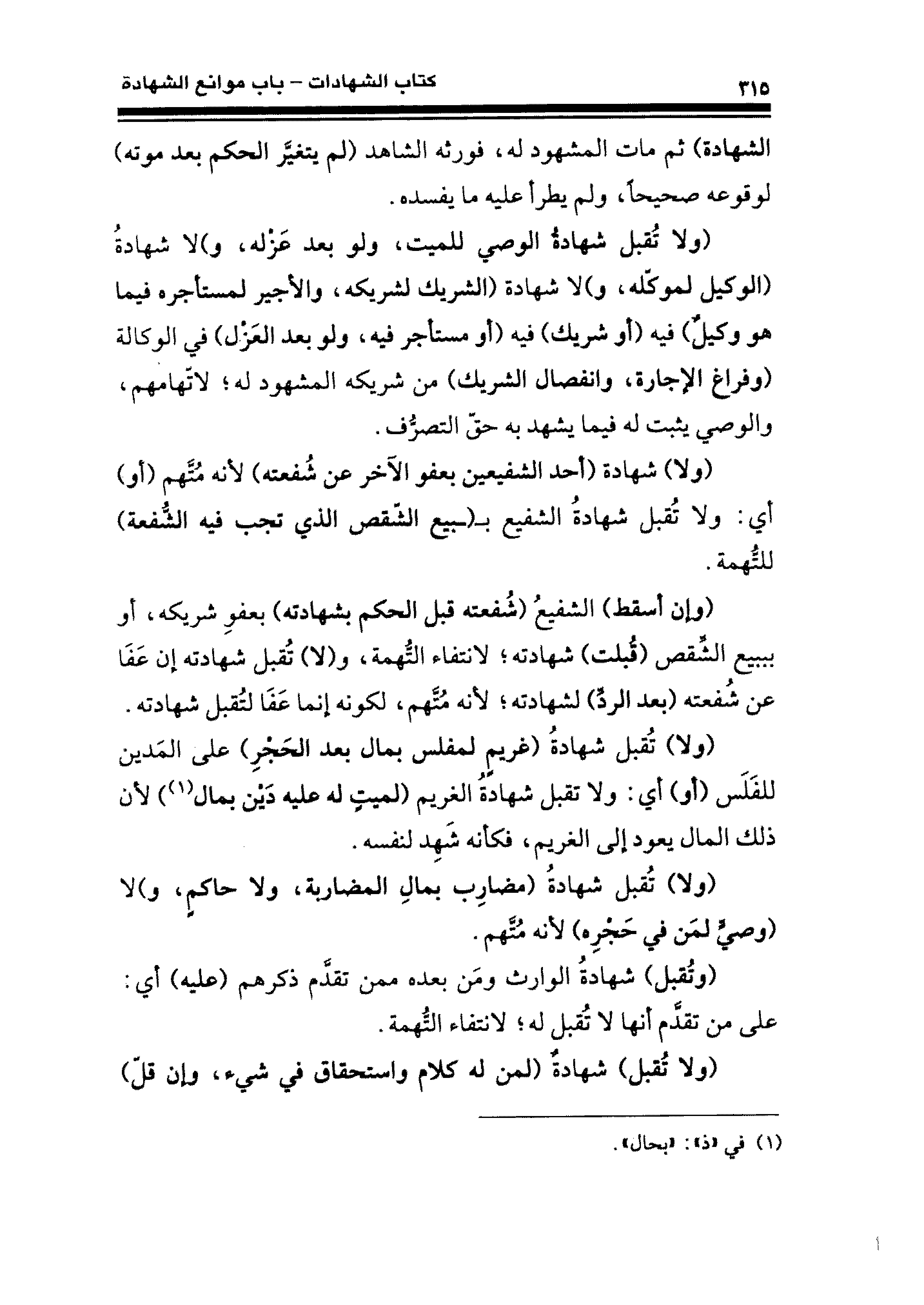 (ولا) شهادة (أحد الشفيعين بعفو الآخر عن شُفعته) لأنه مُتَّهم (أو) أي: ولا تُقبل شهادةُ الشفيع بـ (ـبيع الشّقص الذي تجب فيه الشُّفعة) للتُّهمة.