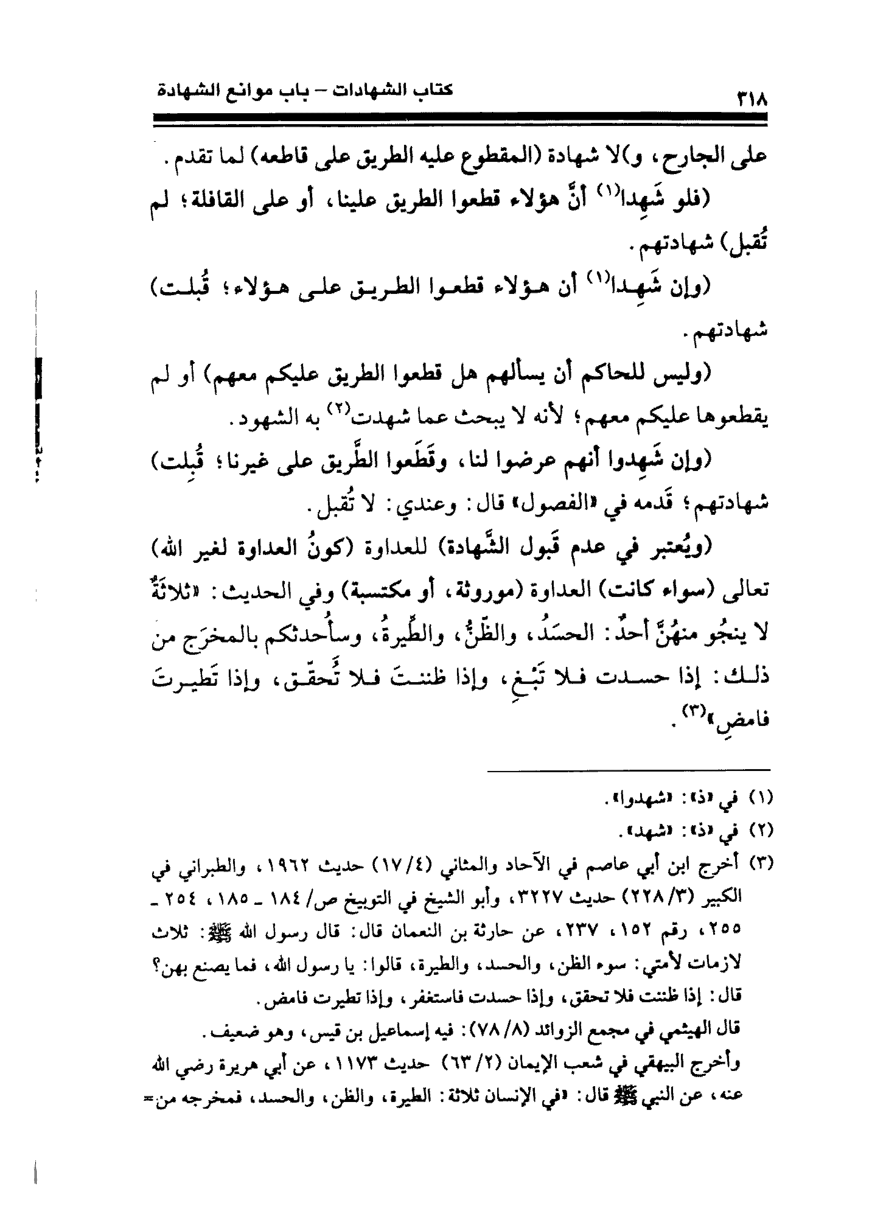 (ويُعتبر في عدم قَبول الشَّهادة) للعداوة (كونُ العداوة لغير الله) تعالى (سواء كانت) العداوة (موروثة، أو مكتسبة) وفي الحديث: "ثلاثَةٌ لا ينجُو منهُنَّ أحدٌ: الحسَدُ، والظّنُّ، والطِّيرةُ، وسأُحدثكم بالمخرَج من ذلك: إذا حسدت فلا تَبْغِ، وإذا ظننتَ فلا تُحقّق، وإذا تَطيرتَ فامضِ" (¬٣).