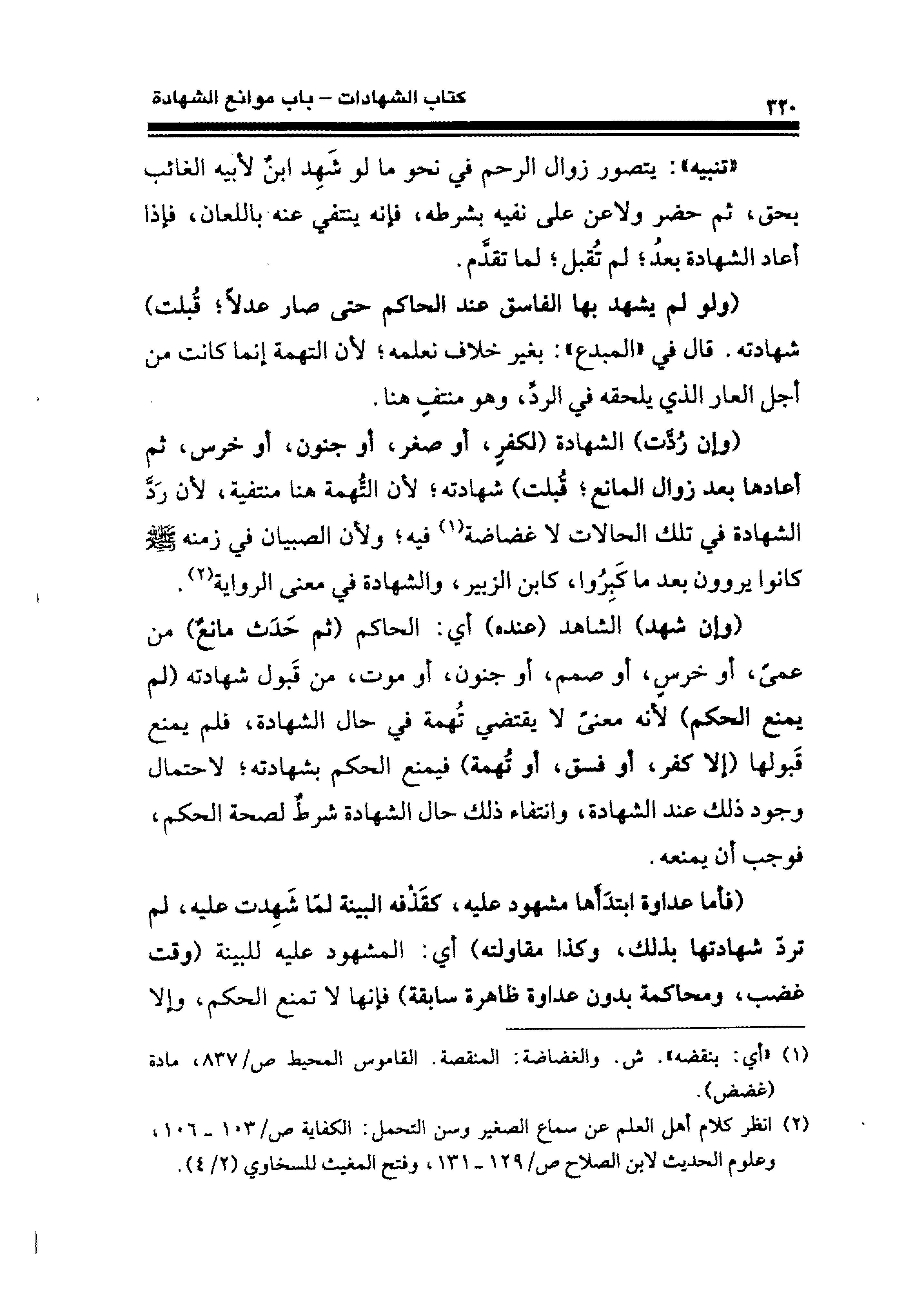 (وإن رُدَّت) الشهادة (لكفرٍ، أو صغر، أو جنون، أو خرس، ثم أعادها بعد زوال المانع؛ قُبلت) شهادته؛ لأن التُّهمة هنا متفية، لأن رَدَّ الشهادة في تلك الحالات لا غضاضة (¬١) فيه؛ ولأن الصبيان في زمنه - صلى الله عليه وسلم - كانوا يروون بعد ما كَبِرُوا، كابن الزبير، والشهادة في معنى الرواية (¬٢).