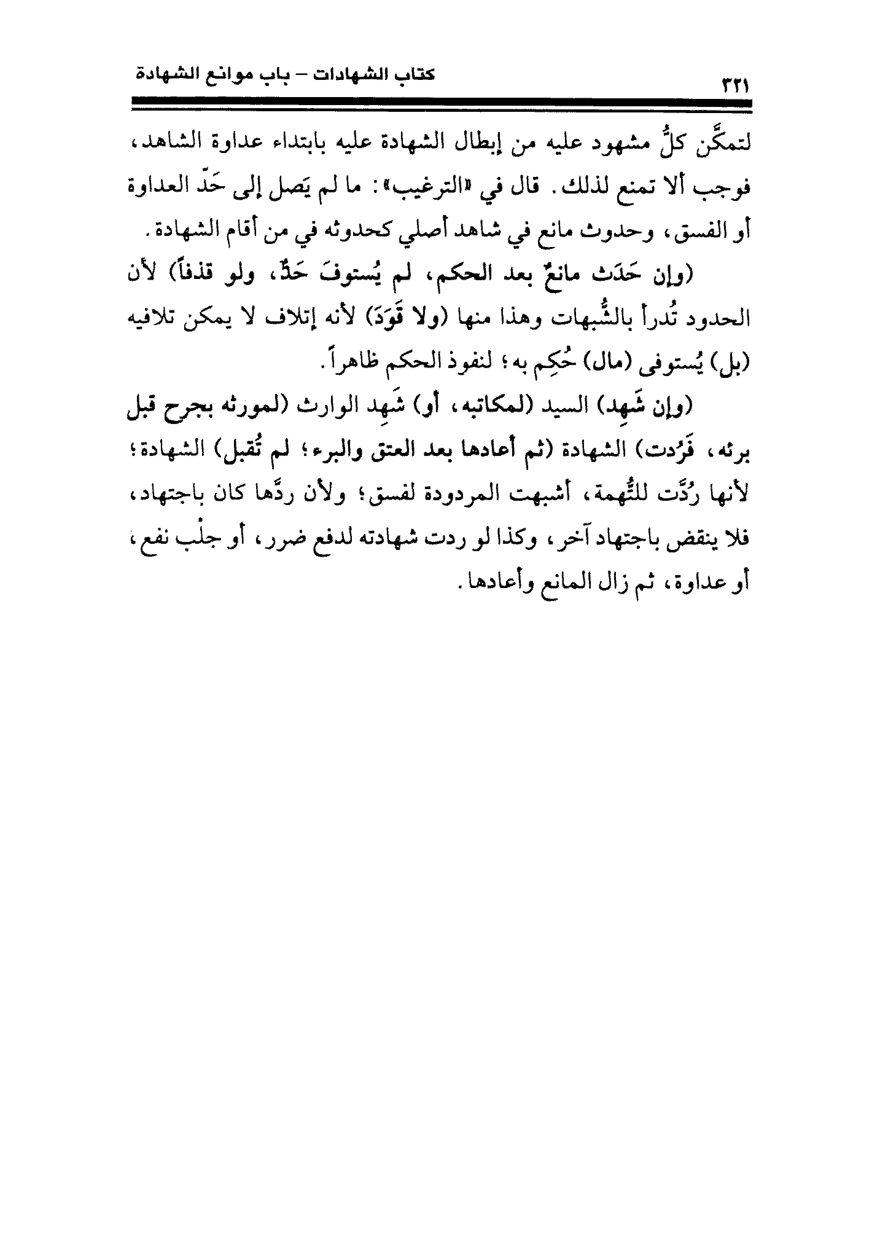 لتمكَّن كلُّ مشهود عليه من إبطال الشهادة عليه بابتداء عداوة الشاهد، فوجب ألا تمنع لذلك. قال في "الترغيب": ما لم يَصل إلى حَدّ العداوة أو الفسق، وحدوث مانع في شاهد أصلي كحدوثه في من أقام الشهادة.