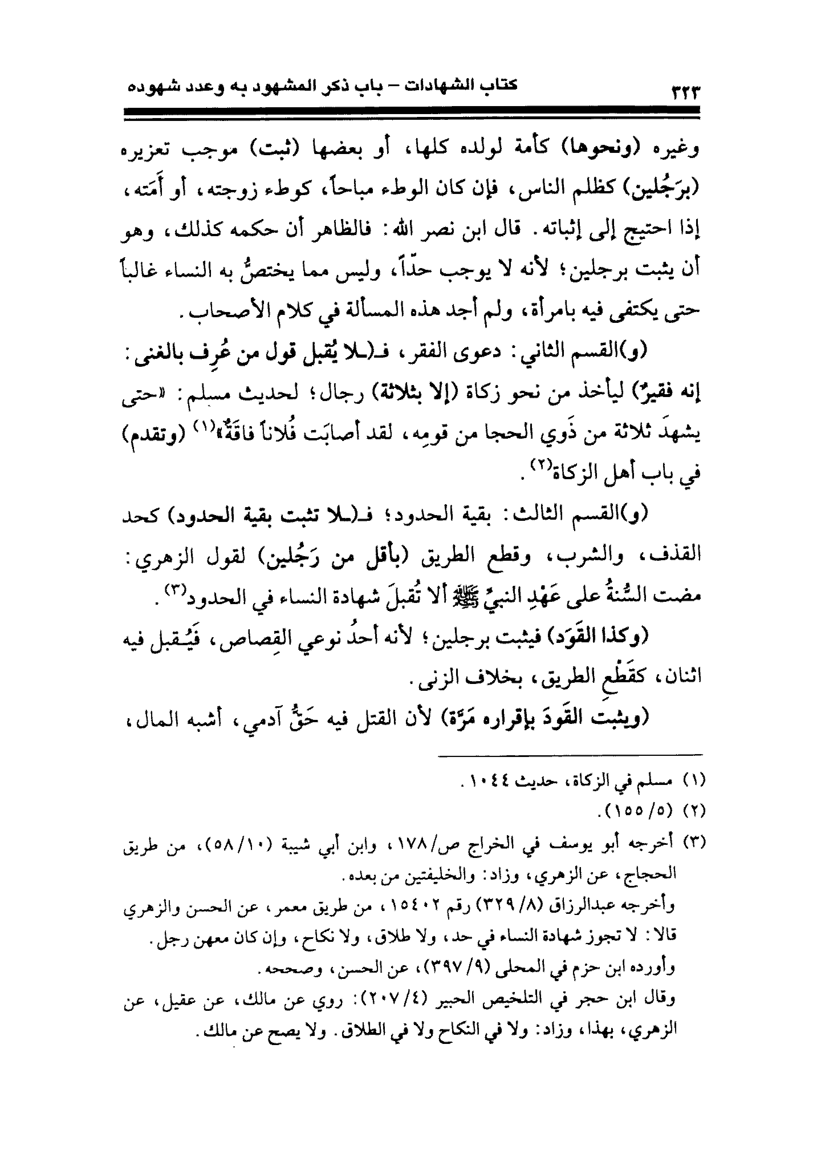 (و) القسم الثالث: بقية الحدود؛ فـ (ـلا تثبت بقية الحدود) كحد القذف، والشرب، وقطع الطريق (بأقل من رجُلين) لقول الزُّهْرِيّ: مضت السُّنةُ على عَهْدِ النبيّ - صلى الله عليه وسلم - ألا تُقبلَ شهادة النساء في الحدود (¬٣).