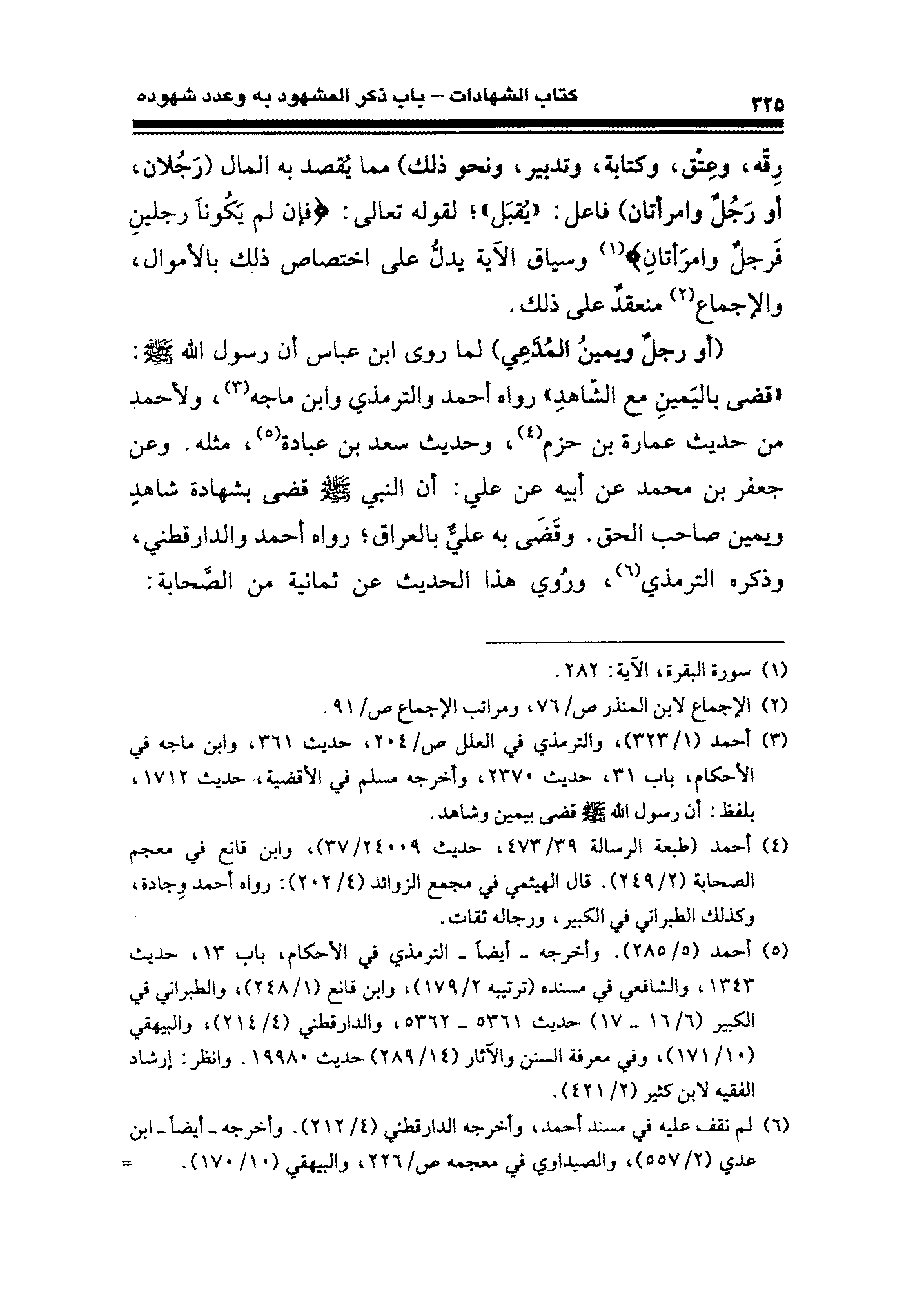 (أو رجلٌ ويمين المُدَّعِي) لما روى ابن عباس أن رسول الله -صلى الله عليه وسلم-: "قضى باليَمينِ مع الشاهدِ" رواه أَحْمد والتِّرمذيّ وابن ماجه (¬٣)، ولأحمد من حديث عمارة بن حزم (¬٤)، وحديث سعد بن عبادة (¬٥)، مثله. وعن جعفر بن محمَّد عن أَبيه عن علي: أن النَّبِيّ -صلى الله عليه وسلم- قضى بشهادة شاهدٍ ويمين صاحب الحق. وقَضَى به عليٌّ بالعراق؛ رواه أَحْمد والدارقطني، وذكره التِّرْمِذِيّ (¬٦)، وروي هذا الحديث عن ثمانية من الصَّحَابَة: