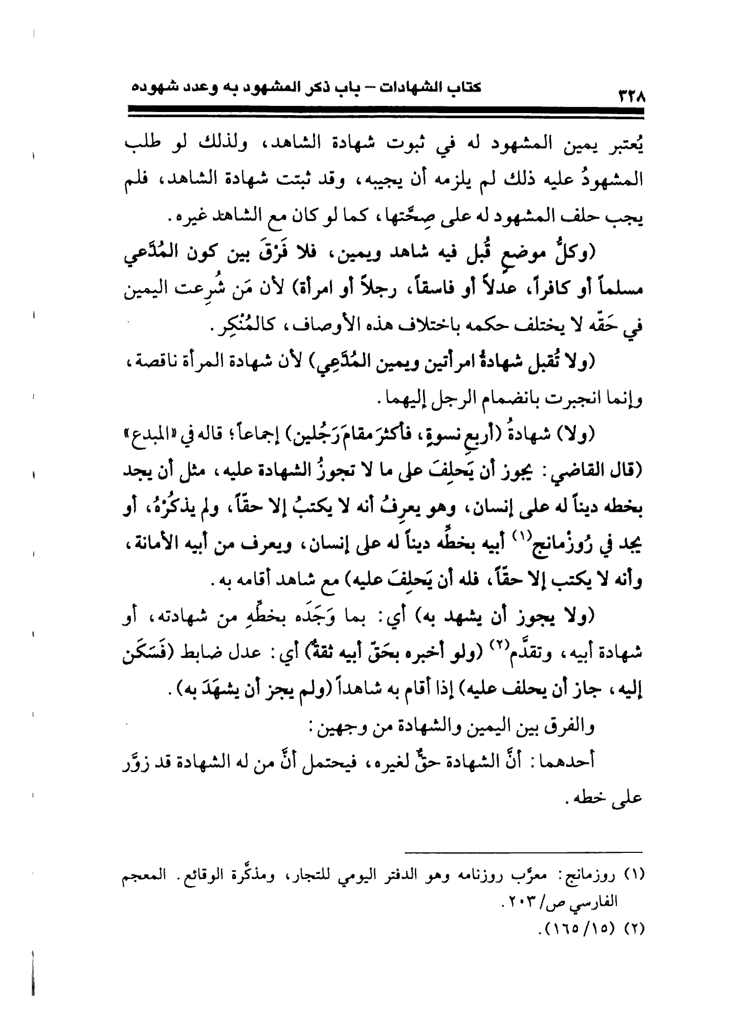 (ولا) شهادةُ (أربعِ نسوةٍ، فأكثرَ مقامَ رَجُلين) إجماعًا؛ قاله في "المبدع" (قال القاضي: يجوز أن يَحلِفَ على ما لا تجوزُ الشهادة عليه، مثل أن يجد بخطه دينًا له على إنسان، وهو يعرِف أنَّه لا يكتب إلَّا حقًّا، ولم يذكُرهُ، أو يجد في رُوزمانج (¬١) أَبيه بخطه دينًا له على إنسان، ويعرف من أبيه الأمانة، وأنه لا يكتب إلَّا حقًا، فله أن يَحلِفَ عليه) مع شاهد أقامه به.