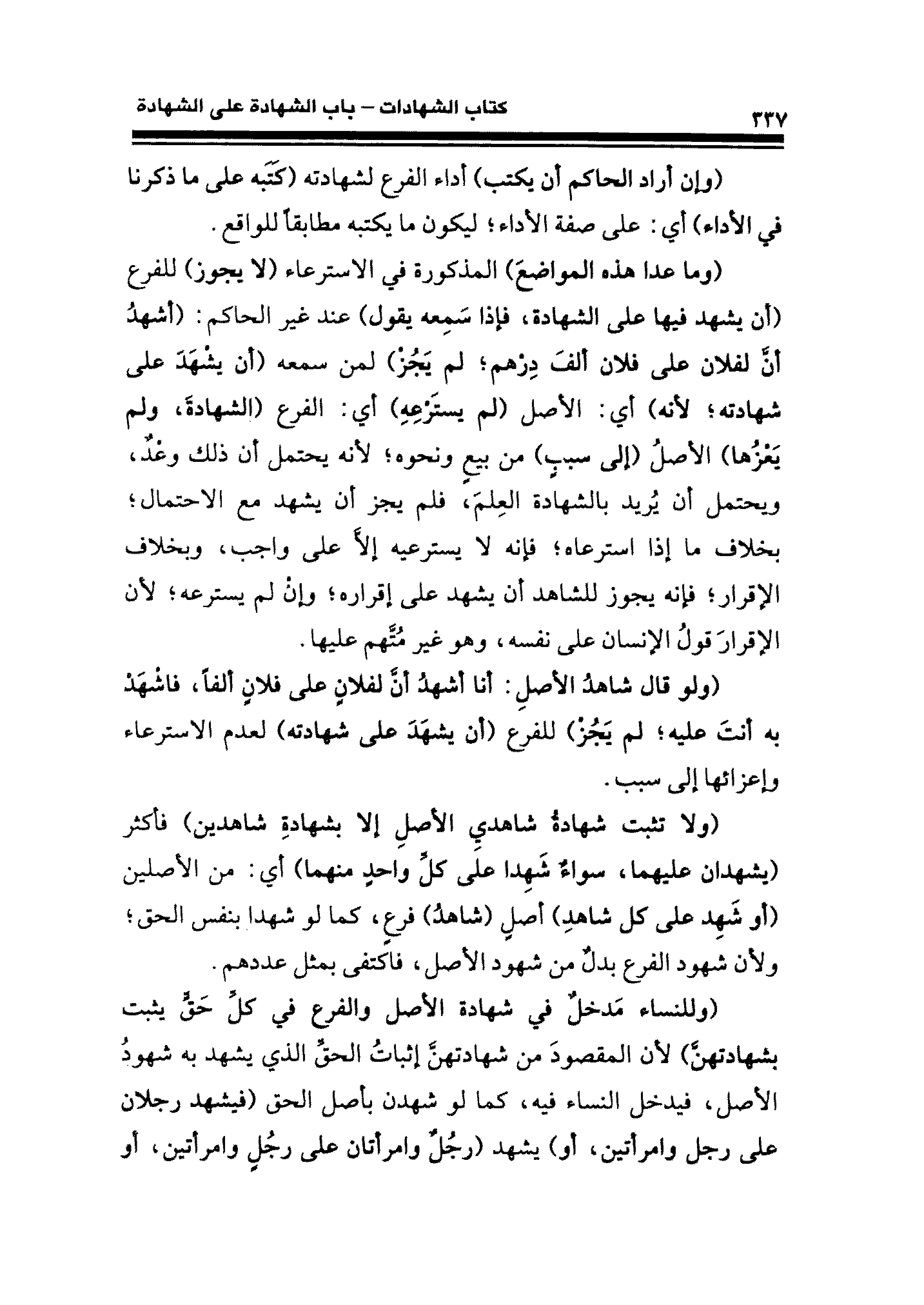 (وما عدا هذه المواضعَ) المذكورة فِي الاسترعاء (لا يجوز) للفرع (أن يشهد فيها على الشهادة، فإذا سَمِعه يقول) عند غير الحاكم: (أشهدُ أنَّ لفلان على فلان ألفَ دِرْهم؛ لم يَجُزْ) لمن سمعه (أن يشْهَدَ على شهادته؛ لأنه) أي: الأصل (لم يستَرْعِهِ) أي: الفرع (الشهادةَ، ولم يَعْزُها) الأصلُ (إِلَى سببٍ) من بيعٍ ونحوه؛ لأنه يحتمل أن ذلك وعْدٌ، ويحتمل أن يُريد بالشهادة العِلمَ، فلم يجز أن يشهد مع الاحتمال؛ بخلاف ما إذا استرعاه؛ فإنَّه لا يسترعيه إلَّا على واجب، وبخلاف الإقرار؛ فإنَّه يجوز للشاهد أن يشهد على إقراره؛ وإنْ لم يسترعه؛ لأن الإقرارَ قولُ الإنسان على نفسه، وهو غير مُتَّهم عليهُا.