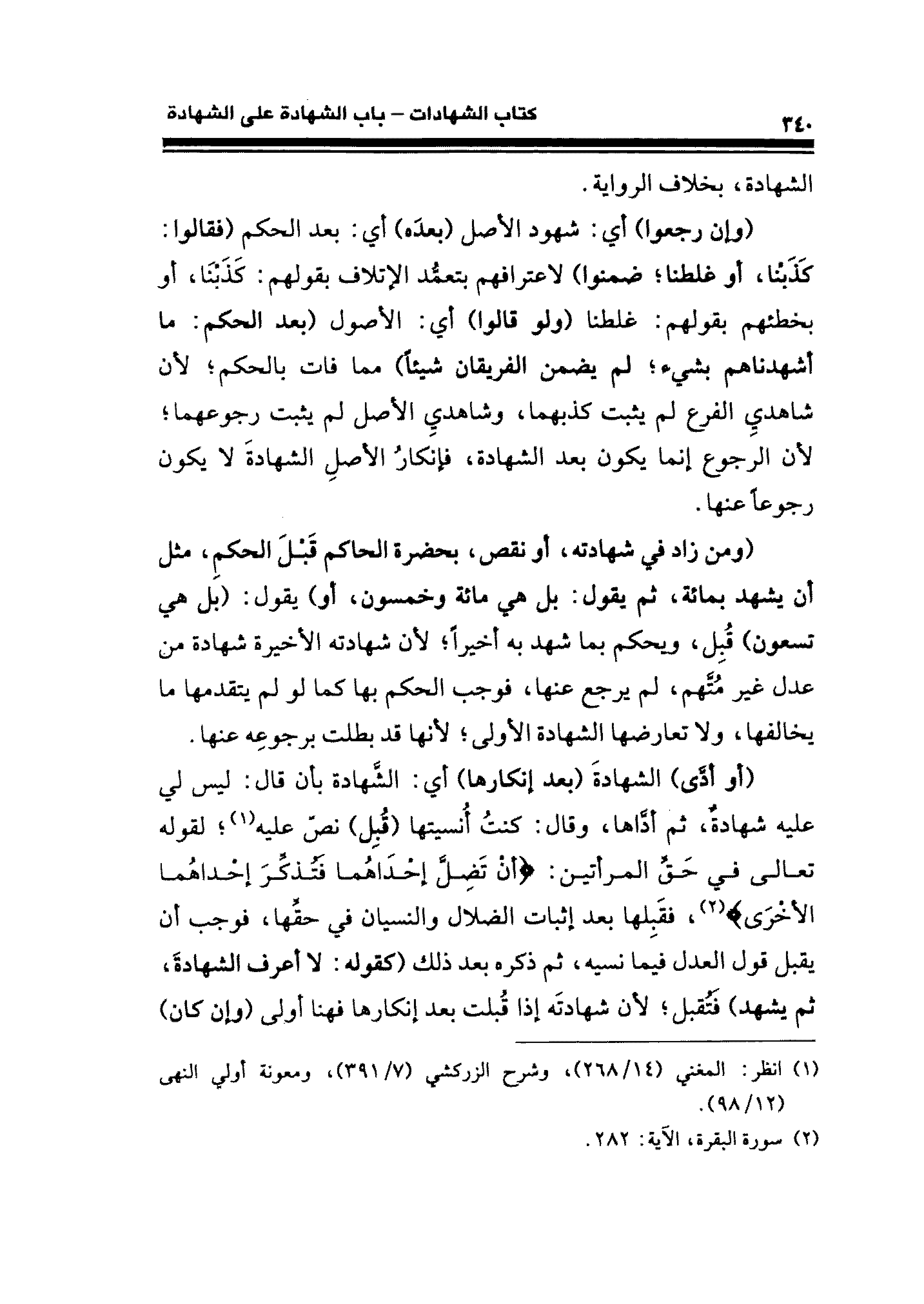 (أو أدَّى) الشهادةَ (بعد إنكارها) أي: الشَّهادة بأن قال: ليس لي عليه شهادةٌ، ثم أدَّاها، وقال: كنتُ أُنسيتها (قُبِل) نصَّ عليه (¬١)؛ لقوله تعالى فِي حَقِّ المرأتين: {أَنْ تَضِلَّ إِحْدَاهُمَا فَتُذَكِّرَ إِحْدَاهُمَا الْأُخْرَى} (¬٢)، فقَبِلها بعد إثبات الضلال والنسيان فِي حقِّها، فوجب أن يقبل قول العدل فيما نسيه، ثم ذكره بعد ذلك (كقوله: لا أعرف الشهادةَ، ثم يشهد) فَتُقبل؛ لأن شهادتَه إذا قُبلت بعد إنكارها فهنا أولى (وإن كان)