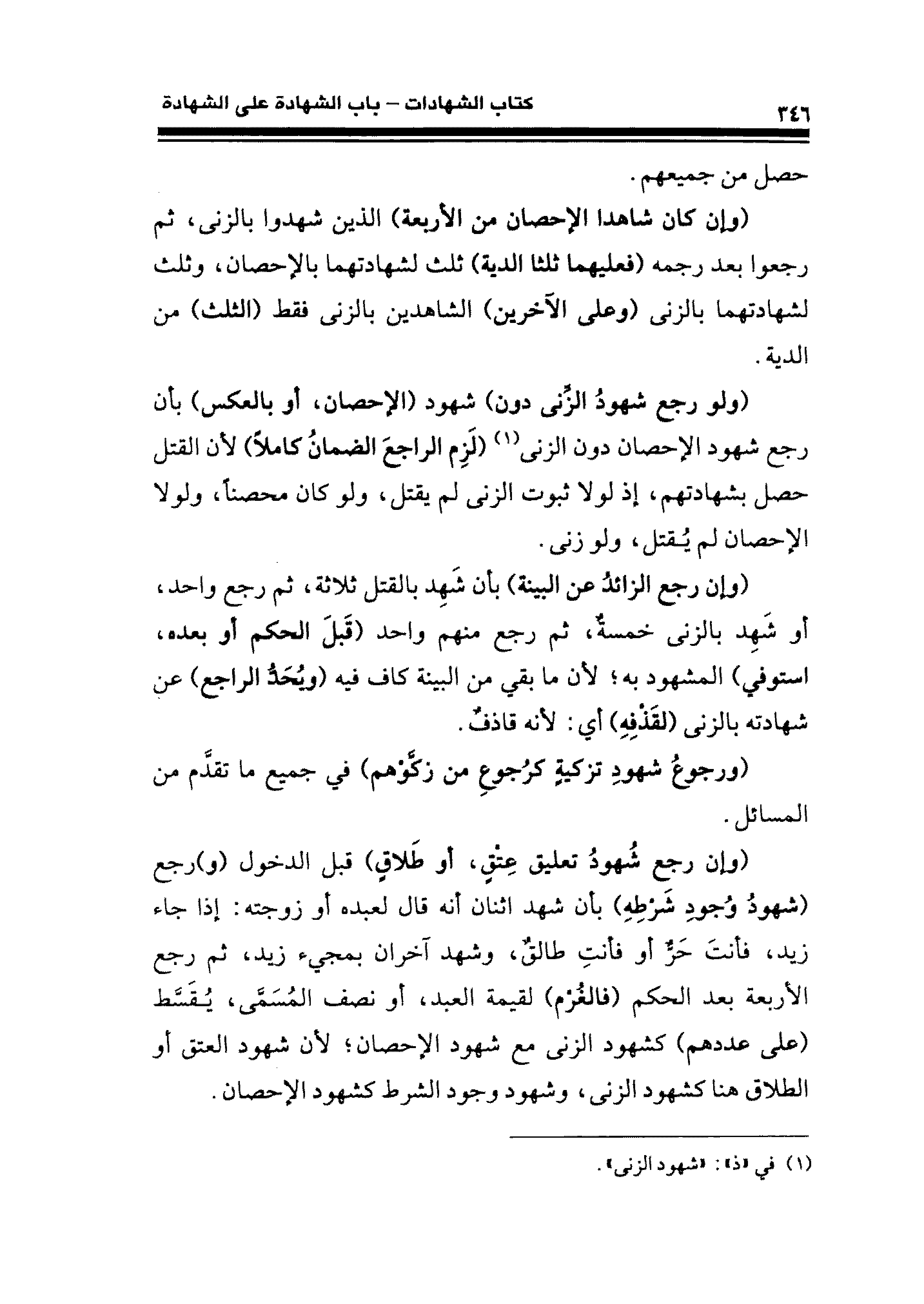 (وإن كان شاهدا الإحصان من الأربعة) الذين شهدوا بالزنى، ثم رجعوا بعد رجمه (فعليهما ثلثا الدية) ثلث لشهادتهما بالإحصان، وثلث لشهادتهما بالزنى (وعلى الآخرين) الشاهدين بالزنى فقط (الثلث) من الدية.