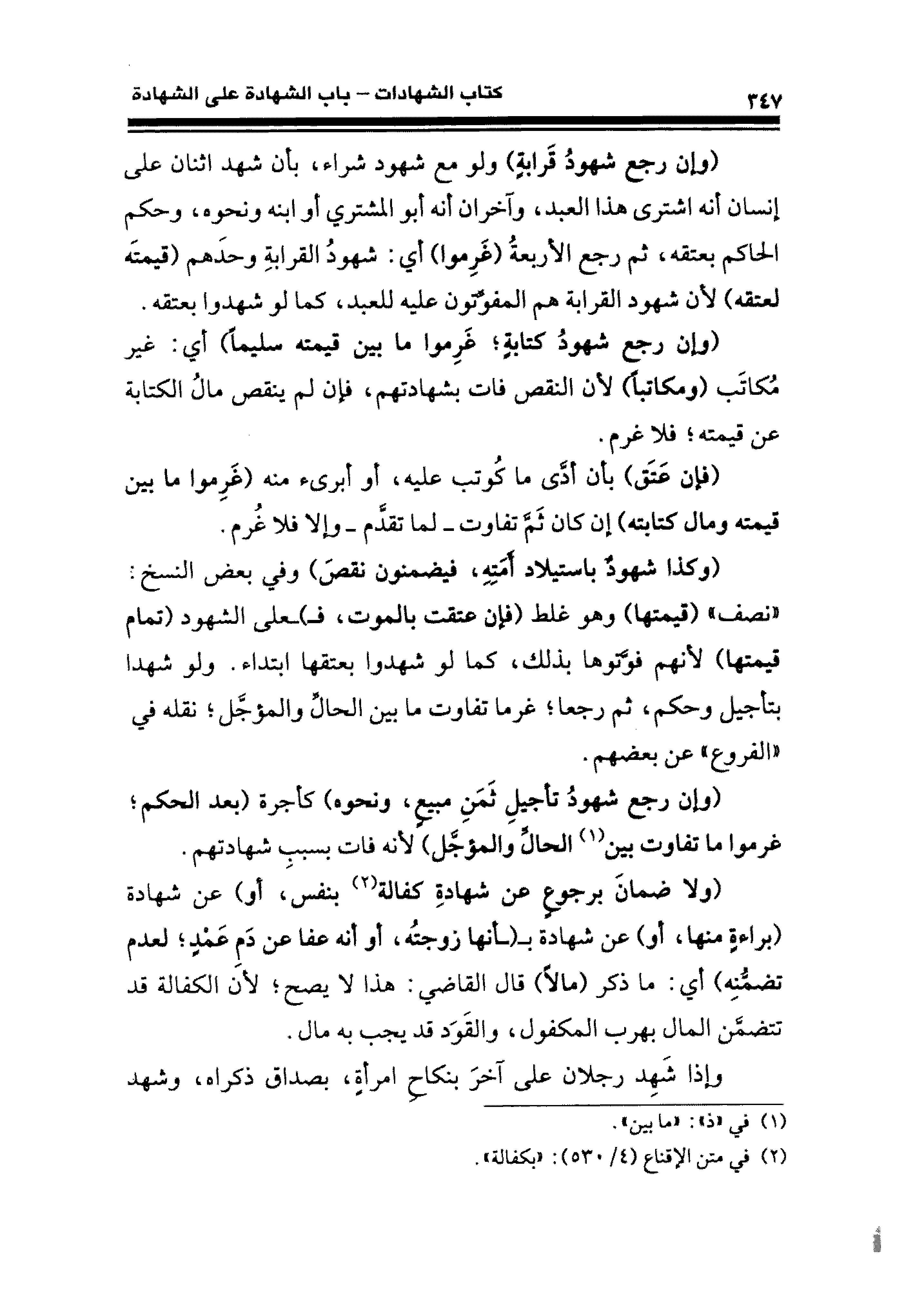 (ولا ضمانَ برجوعٍ عن شهادةِ كفالة (¬٢) بنفس، أو) عن شهادة (براءةٍ منها، أو) عن شهادة بـ (ـأنها زوجتُه، أو أنَّه عفا عن دَم عَمْدٍ؛ لعدم تضمُّنِه) أي: ما ذكر (مالًا) قال القاضي: هذا لا يصح؛ لأنَّ الكفالة قد تتضمَّن المال بهرب المكفول، والقَوَد قد يجب به مال.
