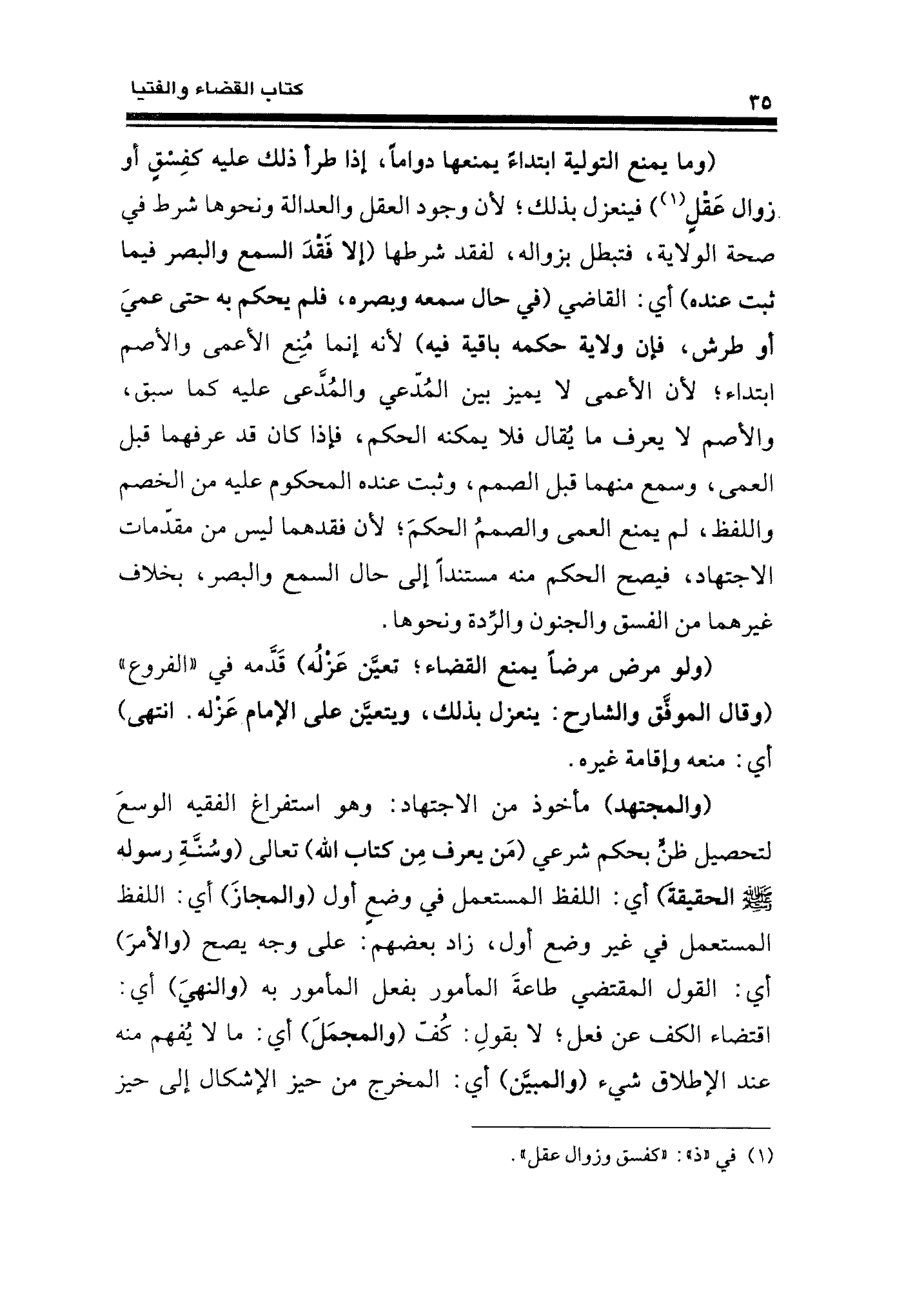 (ولو مرض مرضًا يمنع القضاء؛ تعيَّن عَزْلُه) قَدَّمه في "الفروع" (وقال الموفَّق والشارح: ينعزل بذلك، ويتعيَّن على الإمام عَزْله. انتهى) أي: منعه وإقامة غيره.
