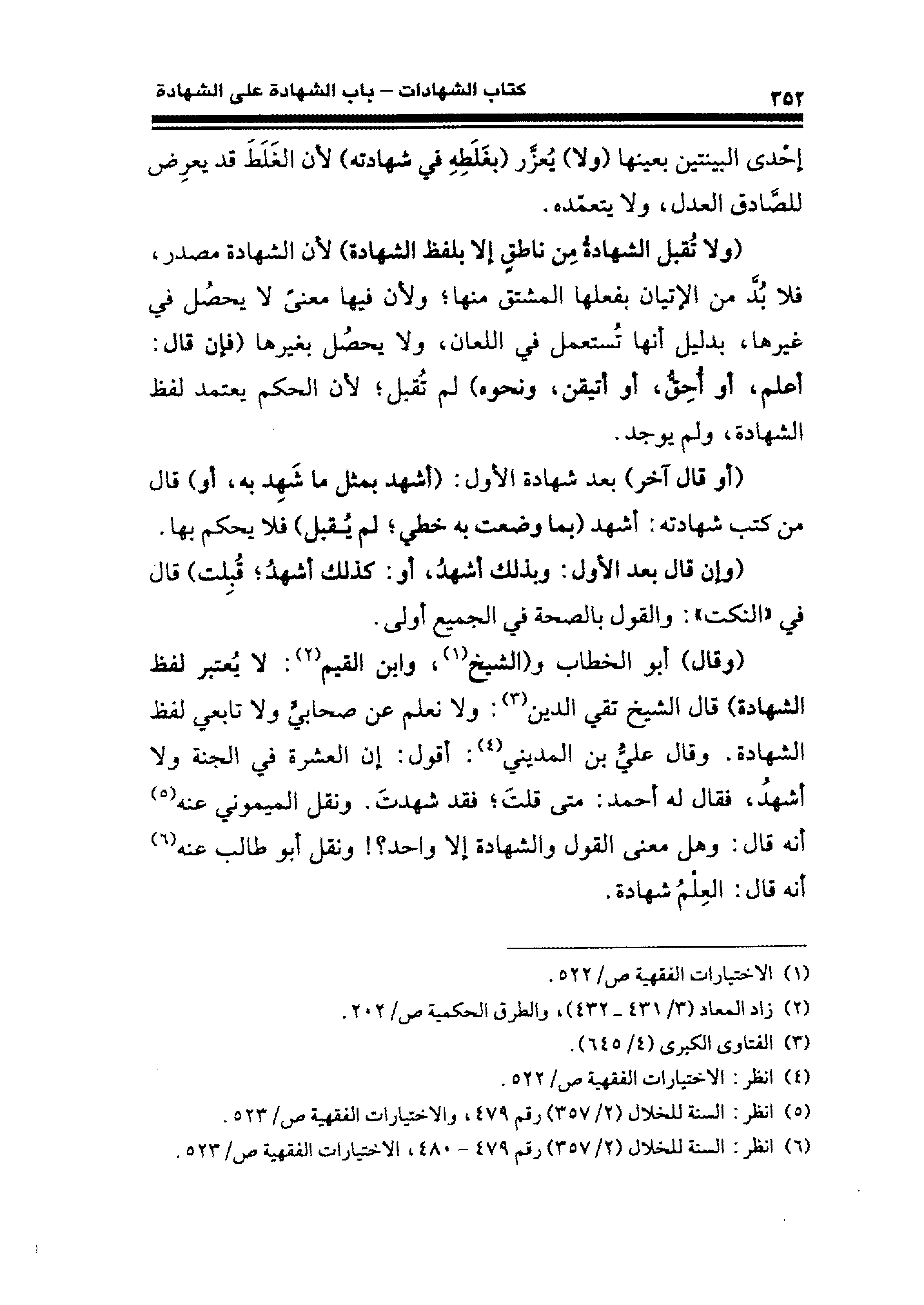 (وقال) أبو الخطاب و (الشيخ (¬١)، وابن القيم (¬٢): لا يُعتبر لفظ الشهادة) قال الشيخ تقي الدين (¬٣): ولا نعلم عن صحابى ولا تابعي لفظ الشهادة. وقال عليُّ بن المديني (¬٤): أقول: إن العشرة في الجنّة ولا أشهدُ، نقال له أحمد: متى قلتَ؛ فقد شهدتَ. ونقل الميموني عنه (¬٥) أنَّه قال: وهل معنى القول والشهادة إلا واحد؟! ونقل أبو طالب عنه (¬٦) أنَّه قال: العِلْمُ شهادة.