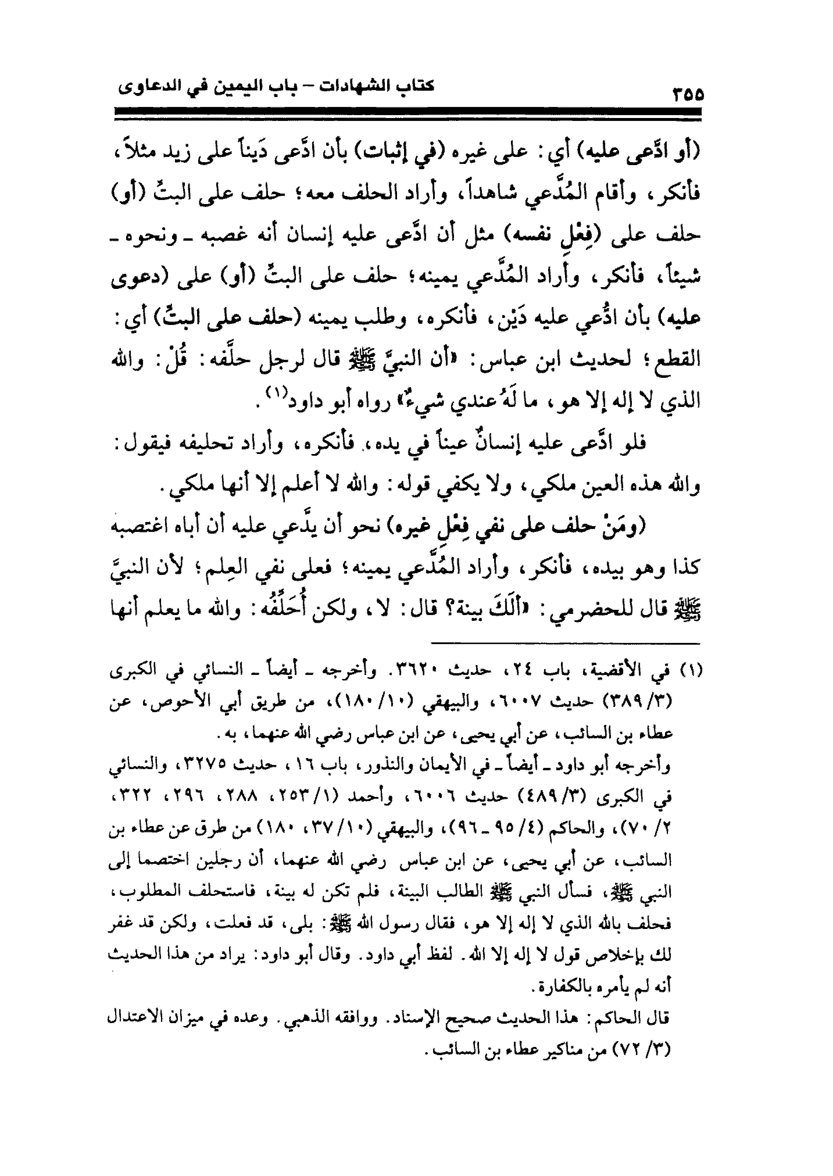 (¬١) في الأقضية، باب ٢٤، حديث ٣٦٢٠. وأخرجه -أيضًا- النسائي في الكبرى (٣/ ٣٨٩) حديث ٦٠٠٧، والبيهقي (١٠/ ١٨٠)، من طريق أبي الأحوص، عن عطاء بن السائب، عن أبي يحيى، عن ابن عباس رضي الله عنهما، به. وأخرجه أبو داود -أيضًا- في الأيمان والنذور، باب ١٦، حديث ٣٢٧٥، والنسائي في الكبرى (٣/ ٤٨٩) حديث ٦٠٠٦، وأحمد (١/ ٢٥٣، ٢٨٨، ٢٩٦، ٣٢٢، ٢/ ٧٠)، والحاكم (٤/ ٩٥ - ٩٦)، والبيهقي (١٠/ ٣٧، ١٨٠) من طرق عن عطاء بن السائب، عن أبي يحيى، عن ابن عباس رضي الله عنهما، أن رجلين اختصما إلى النبي - صلى الله عليه وسلم -، فسأل النبي - صلى الله عليه وسلم - الطالب البينة، فلم تكن له بينة، فاستحلف المطلوب، فحلف بالله الذي لا إله إلا هو، فقال رسول الله - صلى الله عليه وسلم -: بلى، قد فعلت، ولكن قد غفر لك بإخلاص قول لا إله إلا الله. لفظ أبي داود. وقال ابو داود: يراد من هذا الحديث أنه لم يأمره بالكفارة.