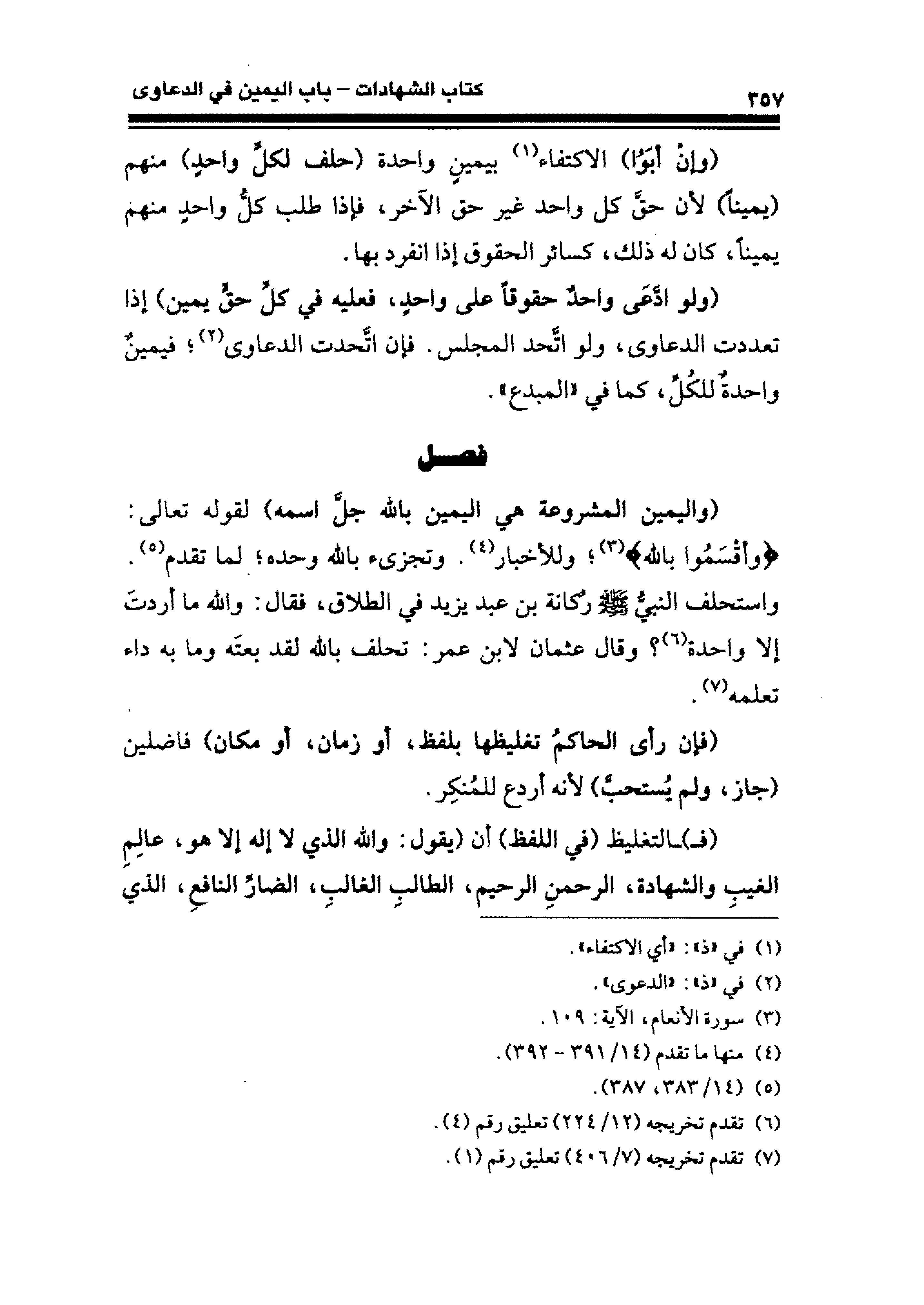 (واليمين المشروعة هي اليمين بالله جلَّ اسمه) لقوله تعالى: {وأقْسَمُوا بالله} (¬٣)؛ وللأخبار (¬٤). وتجزئ بالله وحده؛ لما تقدم (¬٥). واستحلف النبيُّ - صلى الله عليه وسلم - رُكانة بن عبد يزيد في الطلاق، فقال: والله ما أردتَ إلا واحدة (¬٦)؟ وقال عثمان لابن عمر: تحلف بالله لقد بعتَه وما به داء تعلمه (¬٧).