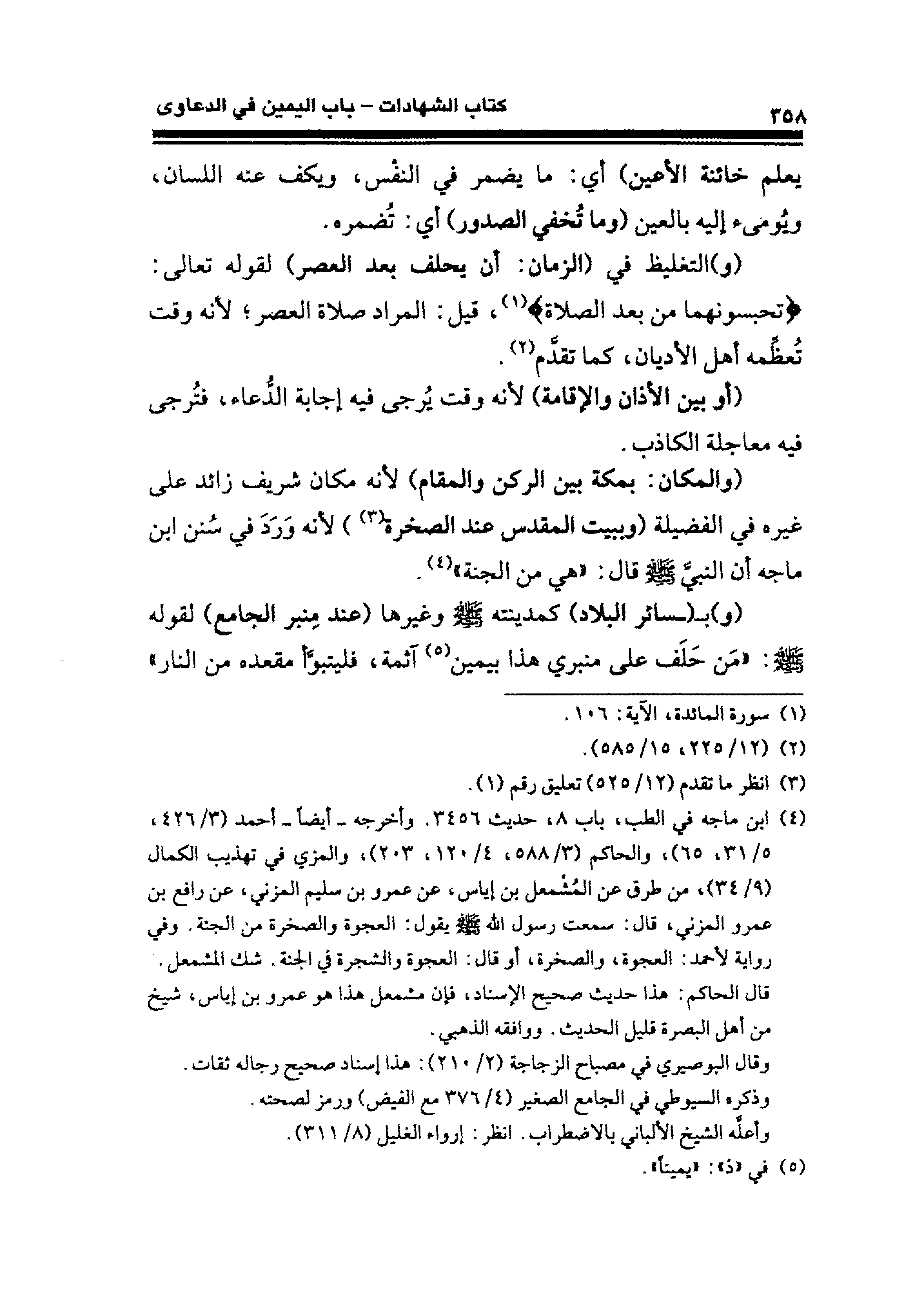 (و) التغليظ في (الزمان: أن يحلف بعد العصر) لقوله تعالى: {تحبسونهما من بعد الصلاة} (¬١)، قيل: المراد صلاة العصر؛ لأنه وقت تُعظِّمه أهل الأديان، كما تقدَّم (¬٢).