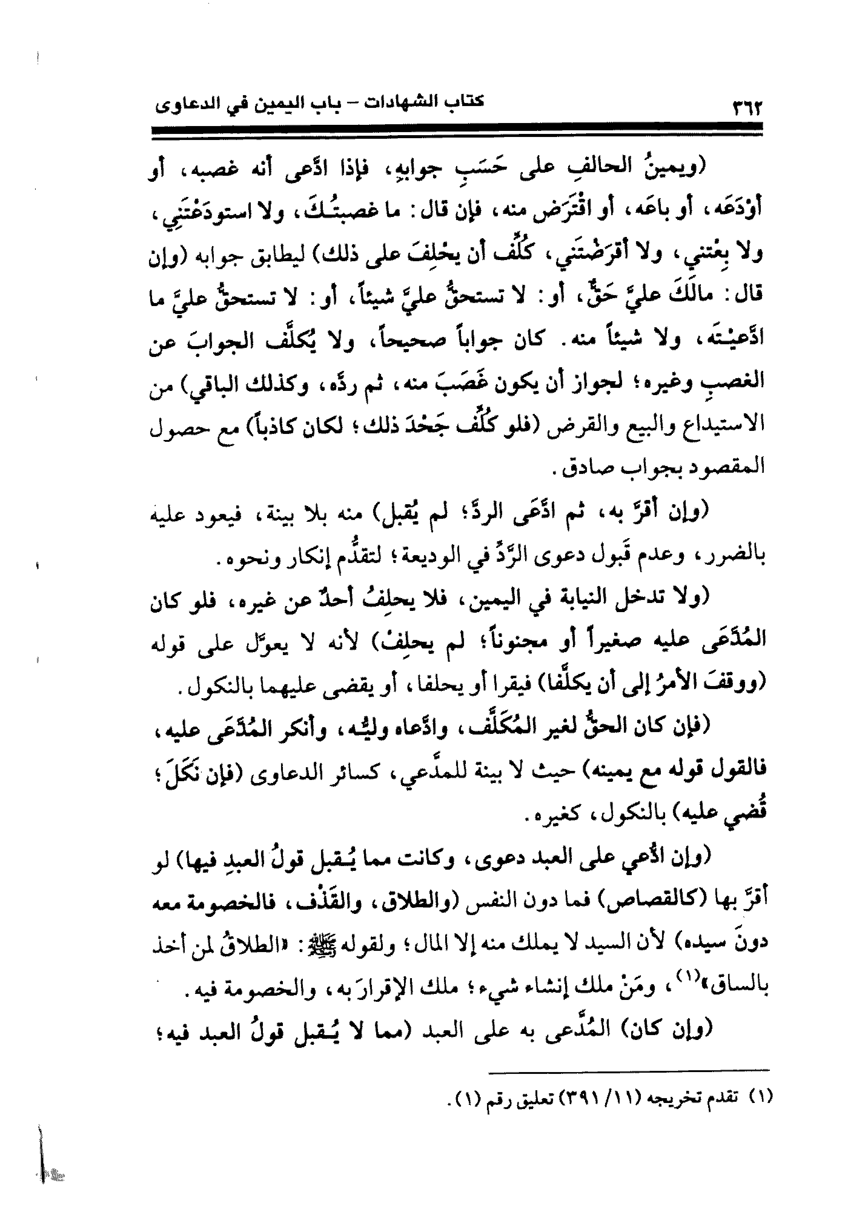 (ولا تدخل النيابة في اليمين، فلا يحلِفُ أحدٌ عن غيره، فلو كان المُدَّعَى عليه صغيرًا أو مجنونًا؛ لم يحلِفْ) لأنه لا يعوَّل على قوله (ووقفَ الأمرُ إلى أن يكلَّفا) فيقرأ أو يحلفا، أو يقضى عليهما بالنكول.