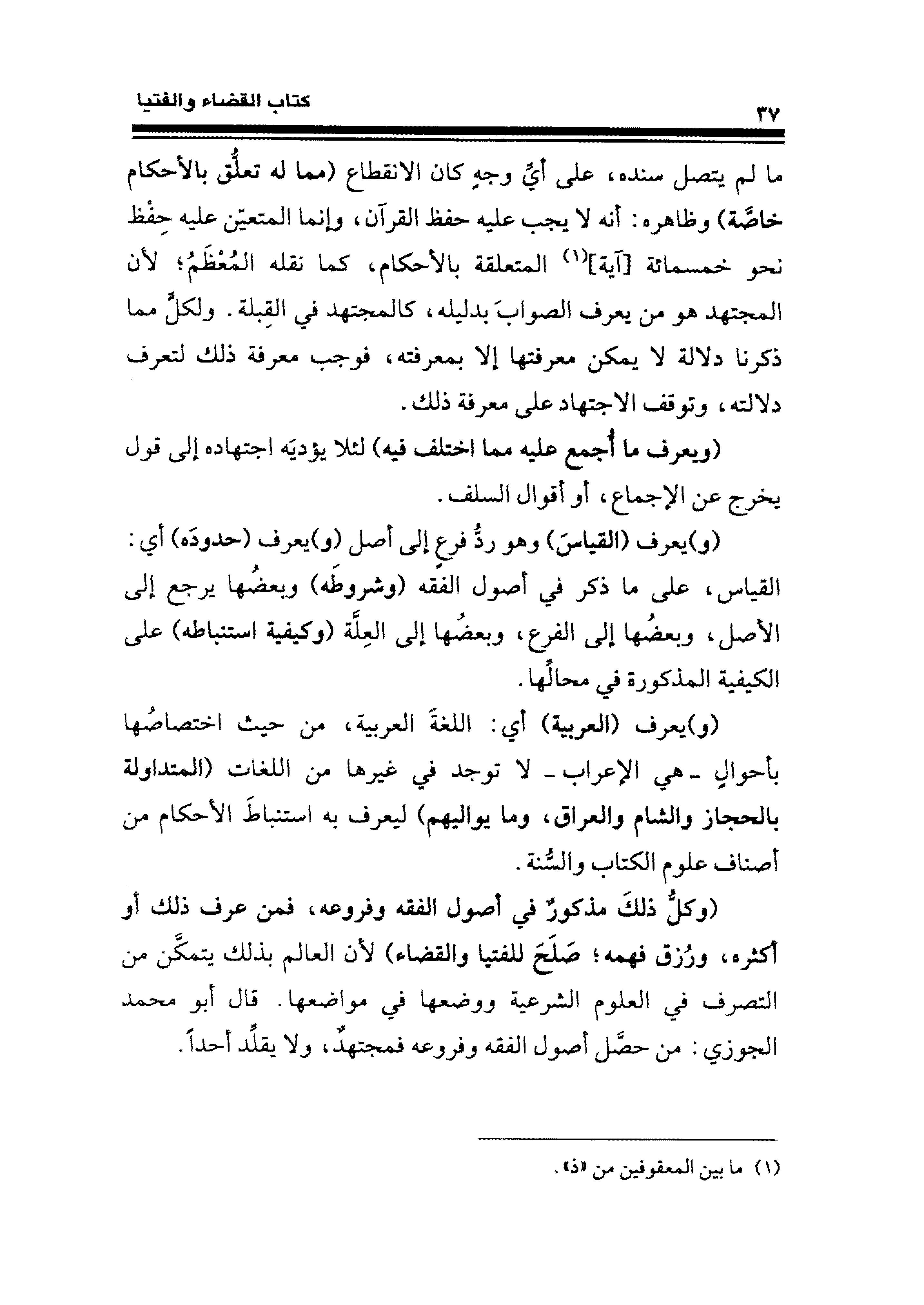 (وكلُّ ذلكَ مذكورٌ في أصول الفقه وفروعه، فمن عرف ذلك أو أكثره، ورُزقه فهمه؛ صَلَحَ للفتيا والقضاء) لأن العالم بذلك يتمكَّن من التصرف في العلوم الشرعية ووضعها في مواضعها. قال أبو محمد الجوزي: من حصَّل أصول الفقه وفروعه فمجتهدٌ، ولا يقلِّد أحدًا.