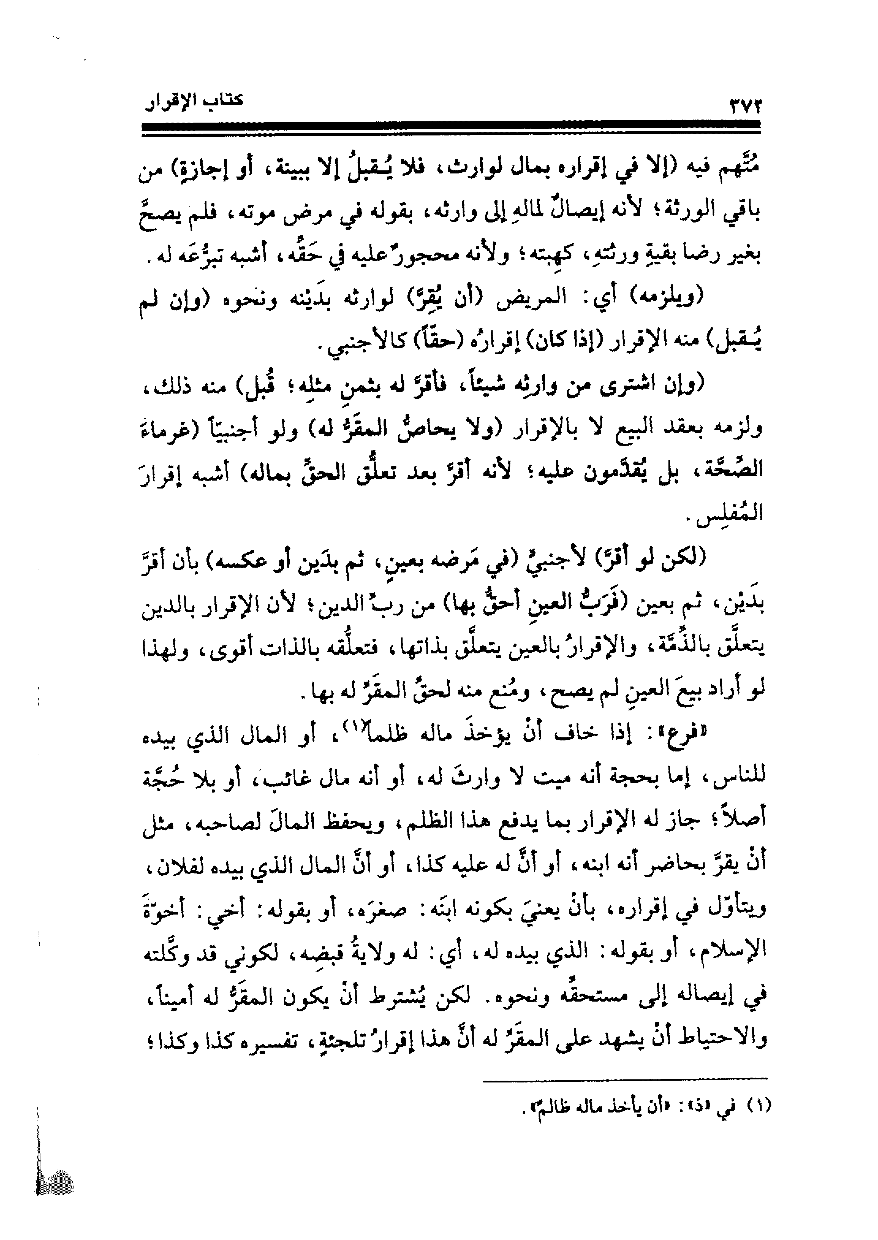 "فرع" إذا خاف أن يؤخذ ماله ظلمًا (¬١) أو المال الذي بيده للناس إما بحجة أنه ميت لا وارثَ له، أو أنه مال غائب، أو بلا حُجة أصلا؛ جاز له الإقرار بما يدفع هذا الظلم، ويحفظ المالَ لصاحبه، مثل أن يقر بحاضر أنه ابنه، أو أنّ له عليه كذا، أو أن المال الذي بيده لفلان، ويتأول في إقراره، بأنْ يعنيَ بكونه ابنه: صغرَه أو بقوله: أخي أخوة الإسلام، أو بقوله: الذي بيده له، أي: له ولايةُ قبضِه لكوني قد وكَّلته في إيصاله إلى مستحقه ونحوه. لكن يشترط أنْ يكون المقرُّ له أمينا، والاحتياط أن يشهد على المقرّ له أنَّ هذا إقرار تلجئةٍ، تفسيره كذا وكذا؛