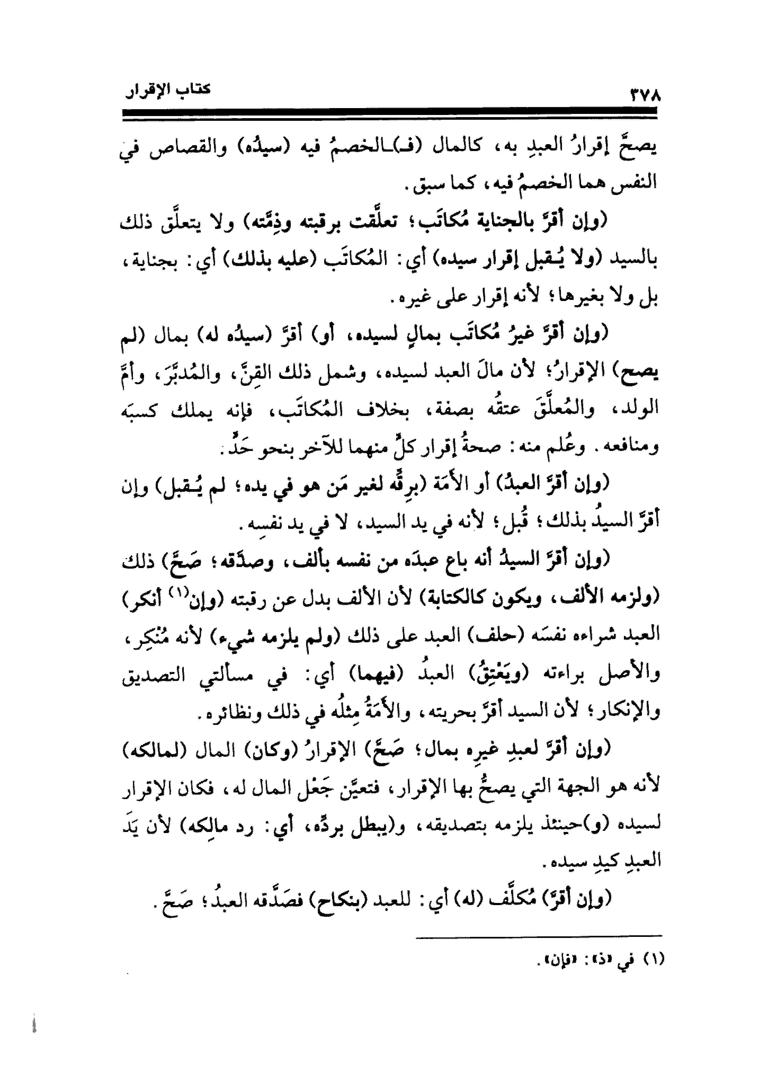 (وإن أقرَّ غيرُ مكاتب بمالٍ لسيده، أو) أقرّ (سيدُه له) بمال (لم يصح) الإقرار؛ لأن مال العبد لسيده، وشمل ذلك القِنّ والمدبَّر، وأمَّ الولد، والمُعلَّقَ عتقه بصفة، بخلاف المُكاتَب، فإنه يملك كسبَه ومنافعه، وعُلم منه: صحةُ إقرار كلٍّ منهما للآخر بنحو حَدّ.