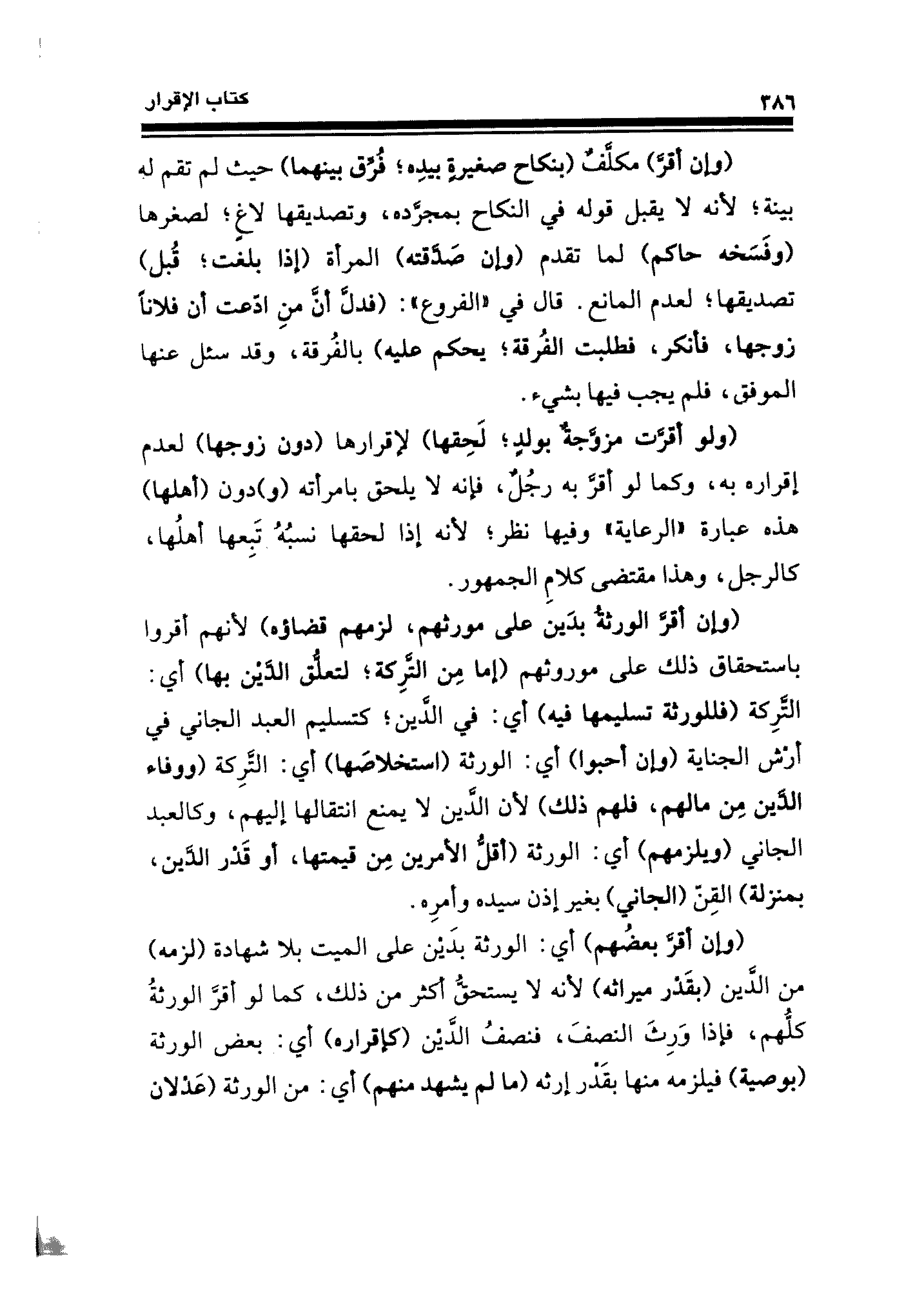 (وإن أقرَّ بعضهم) أي: الورثة بدَين على الميت بلا شهادة (لزمه) من الدَّين (بقَدْر ميراثه) لأنه يستحقُّ أكثر من ذلك، كما لو أقرَّ الورثةُ كلهم، فإذا وَرِثَ النصفَ، فنصفُ الدَّين (كإقراره) أي: بعض الورثة (بوصية) فيلزمه منها بقَدْر إرثه (ما لم يشهد منهم) أي: من الورثة (عَدْلان