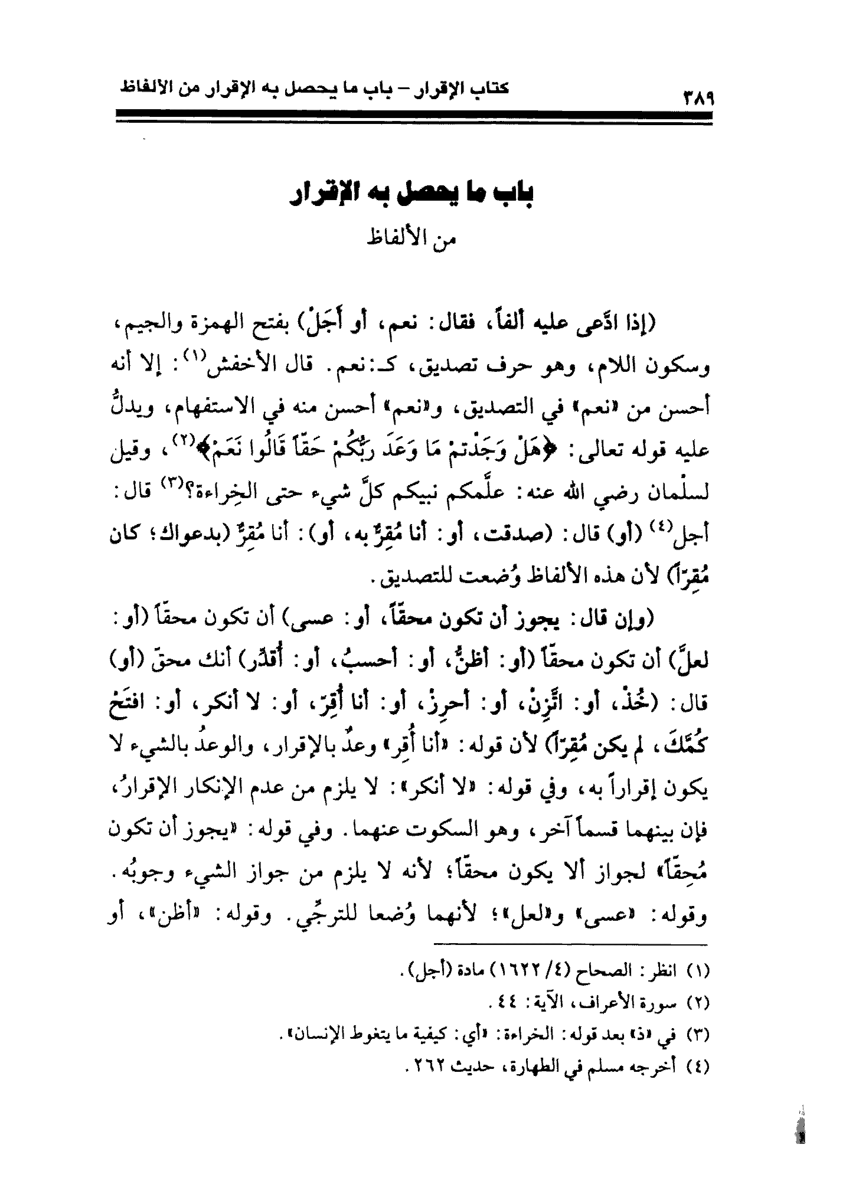 (إذا ادّعى عليه ألفًا، فقال: نعم، أو أَجَلْ) بفتح الهمزة والجيم، وسكون اللام، وهو حرف تصديق، كـ: نعم. قال الأخفش (¬١): إلا إنه أحسن من "نعم" في التصديق، و"نعم" أحسن منه في الاستفهام، ويدل عليه قوله تعالى: {فَهَلْ وَجَدْتُمْ مَا وَعَدَ رَبُّكُمْ حَقًّا قَالُوا نَعَمْ} (¬٢)، وقيل لسلمان -رضي الله عنه-: علَّمكم نبيكم كلَّ شيء حتى الخِراءة؟ (¬٣)؟ قال: أجل (¬٤) (أو) قال: (صدقت، أو: أنا مُقِرٌّ به أو) أنا مُقِرٌّ (بدعواك؛ كان مُقِرًّا) لأن هذه الألفاظ وُضعت للتصديق.