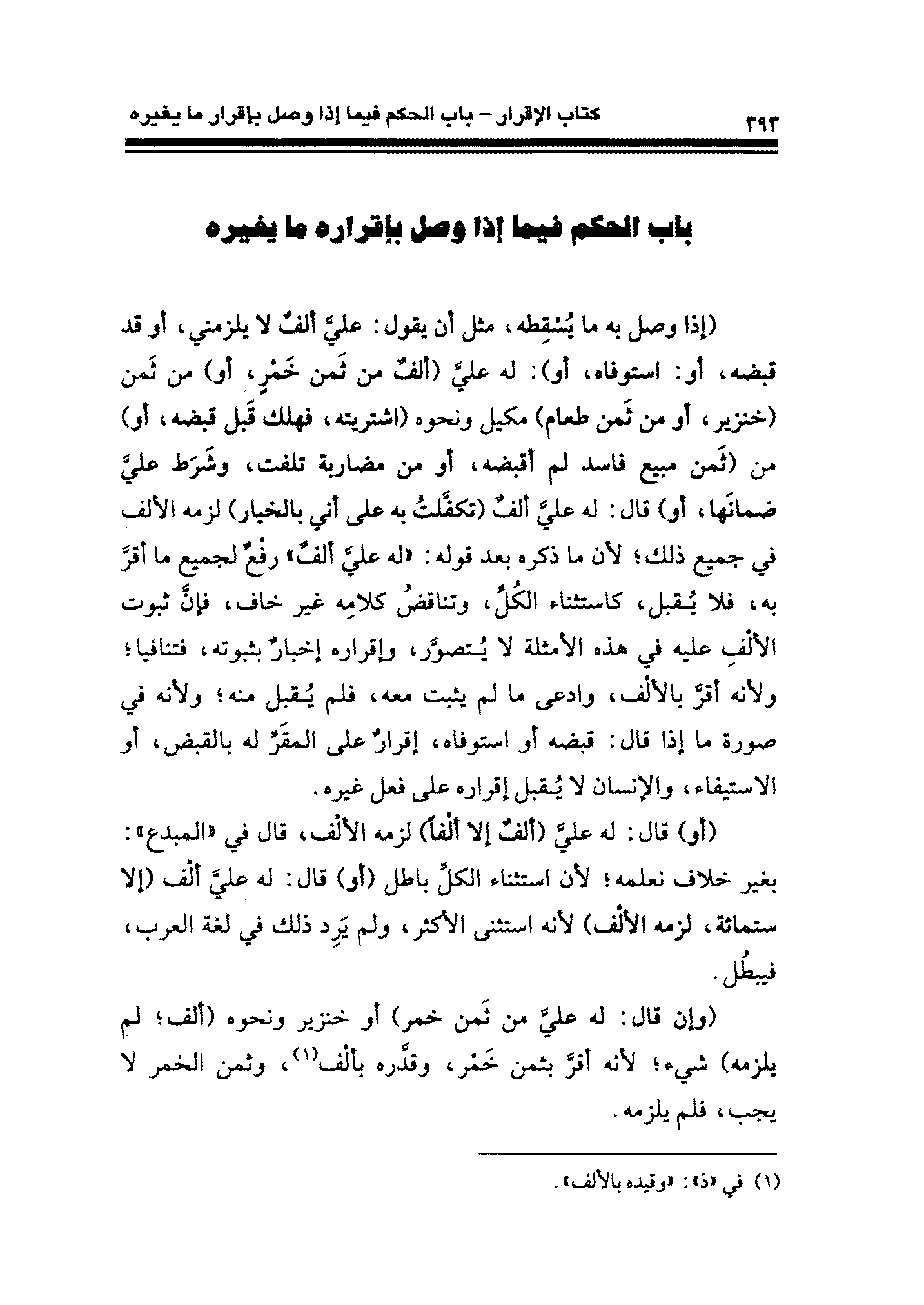 (إذا وصل يه ما يُسْقِطه، مثل أن يقول: عليَّ ألفٌ لا يلزمني، أو قد قبضه، أو: استوفاه، أو): له عليَّ (ألفٌ من ثَمن خَمْرٍ، أو) من ثَمن (خنزير، أو من ثَمن طعام) مكيل ونحوه (اشتريته، فهلك قَبل قبضه، أو) من (ثَمن مبيع فاسد لم أقبضه، أو من مضارمة تلفت، وشَرَط عليَّ ضمانَها، أو) قال: له عليَّ ألفٌ (تكفَّلتُ به على أني بالخيار) لزمه الألف في جميع ذلك؛ لأن ما ذكره بعد قوله: "له عليَّ ألفٌ" رفْعٌ لجميع ما أقرَّ به، فلا يُقبل، كاستثناء الكُلِّ، وتناقضُ كلامِه غير خاف، فإنَّ ثبوت الألْفِ عليه في هذه الأمثلة لا يُتصوَّر، وإقراره إخبارٌ بثبوته، فتنافيا؛ ولأنه أقرَّ بالألْف، وادعى ما لم يثيت معه، فلم يُقبل منه؛ ولأنه في صورة ما إذا قال: قبضه أو استوفاه، إقرارٌ على المقَرِّ له بالقبض، أو الاستيفاء، والإنسان لا يُقبل إقراره على فعل غيره.