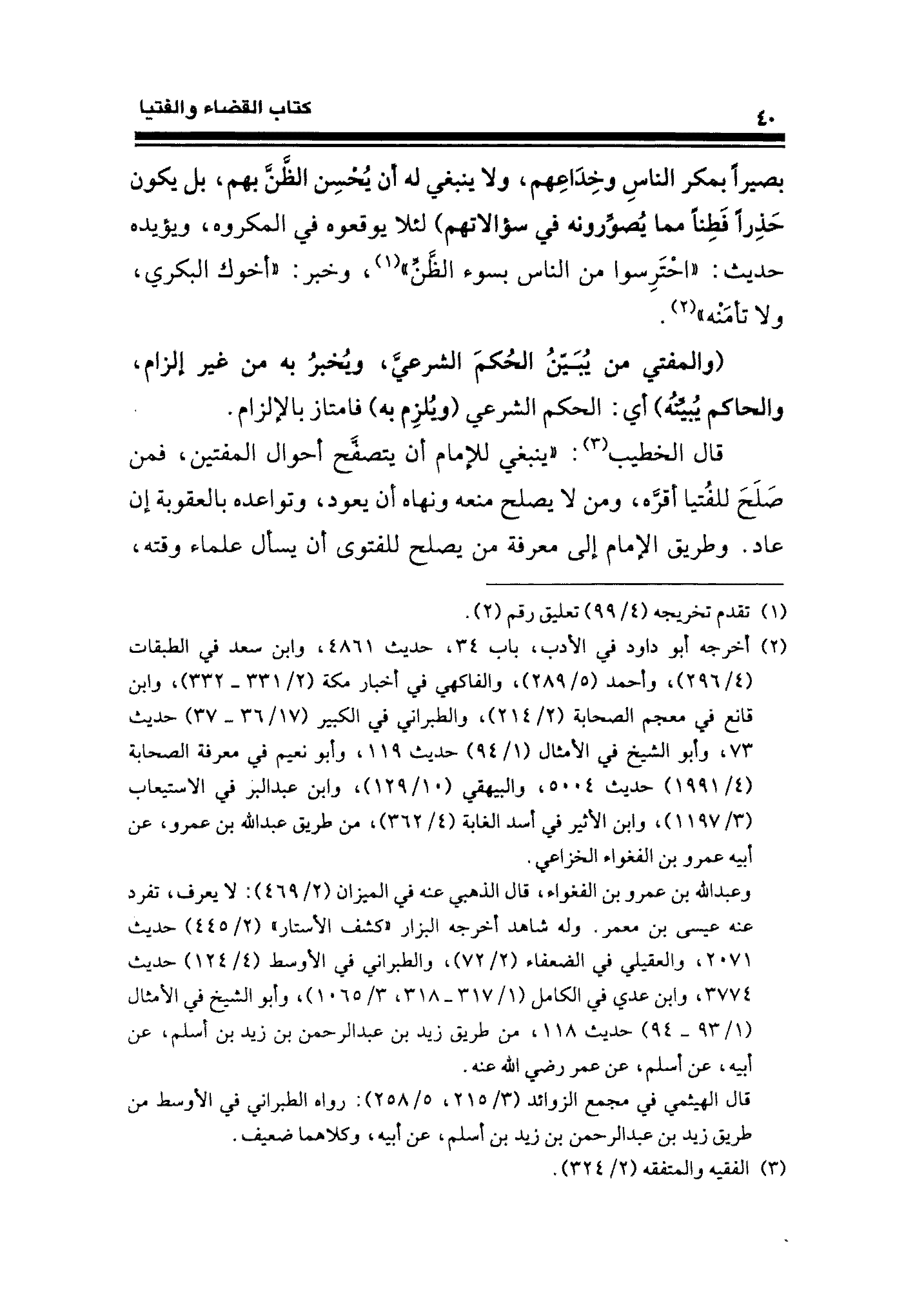 بصيرًا بمكر الناسِ وخِدَاعِهم، ولا ينبغي له أن يُحسِن الظَّنَّ بهم، بل بكون حَذِرا فَطِنًا مما يُصوِّرونه في سؤالاتهم) لئلا يوقعوه في المكروه، ويؤيده حديث: "احتَرِسوا من الناس بسوء الظَّنِّ" (¬١)، وخبر: "أخوك البكري، ولا تأمَنْه" (¬٢).