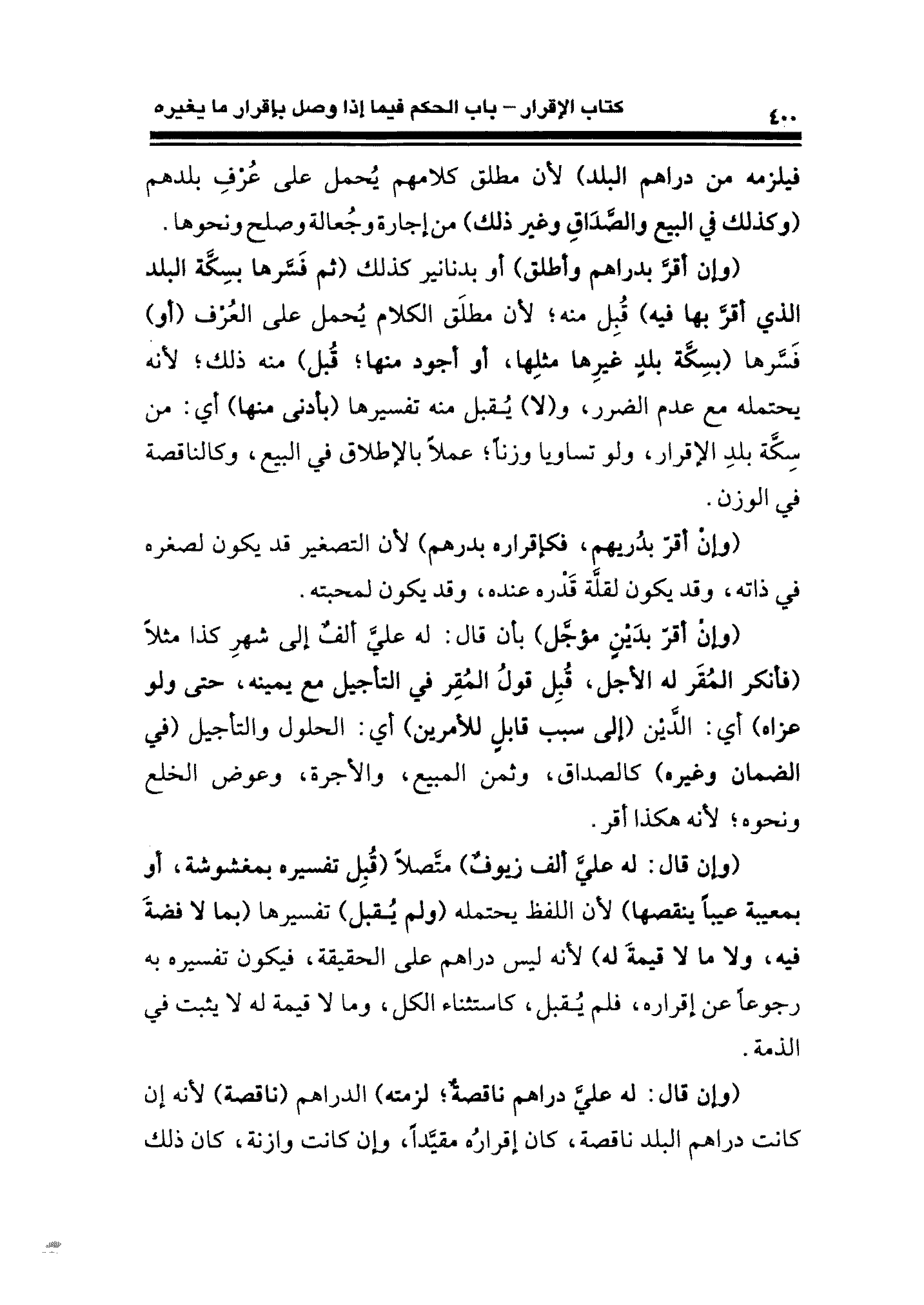 (وإن أقرَّ بدراهم وأطلق) أو بدنانير كذلك (ثم فَسَّرها بسِكَّة البلد الذي أقرَّ بها فيه) قُبِل منه؛ لأن مطلَق الكلام يُحمل على العُرْف (أو) فَسَّرها (بسِكَّة بلدٍ غيرِها مثلِها، أو أجود منها؛ قُبل) منه ذلك؛ لأنه يحتمله مع عدم الضرر، و (لا) يُقبل منه تفسيرها (بِأدنى منها) أي: من سِكَّة بلدِ الإقرار، ولو تساويا وزنًا؛ عملًا بالإطلاق في البيع، وكالناقصة في الوزن.