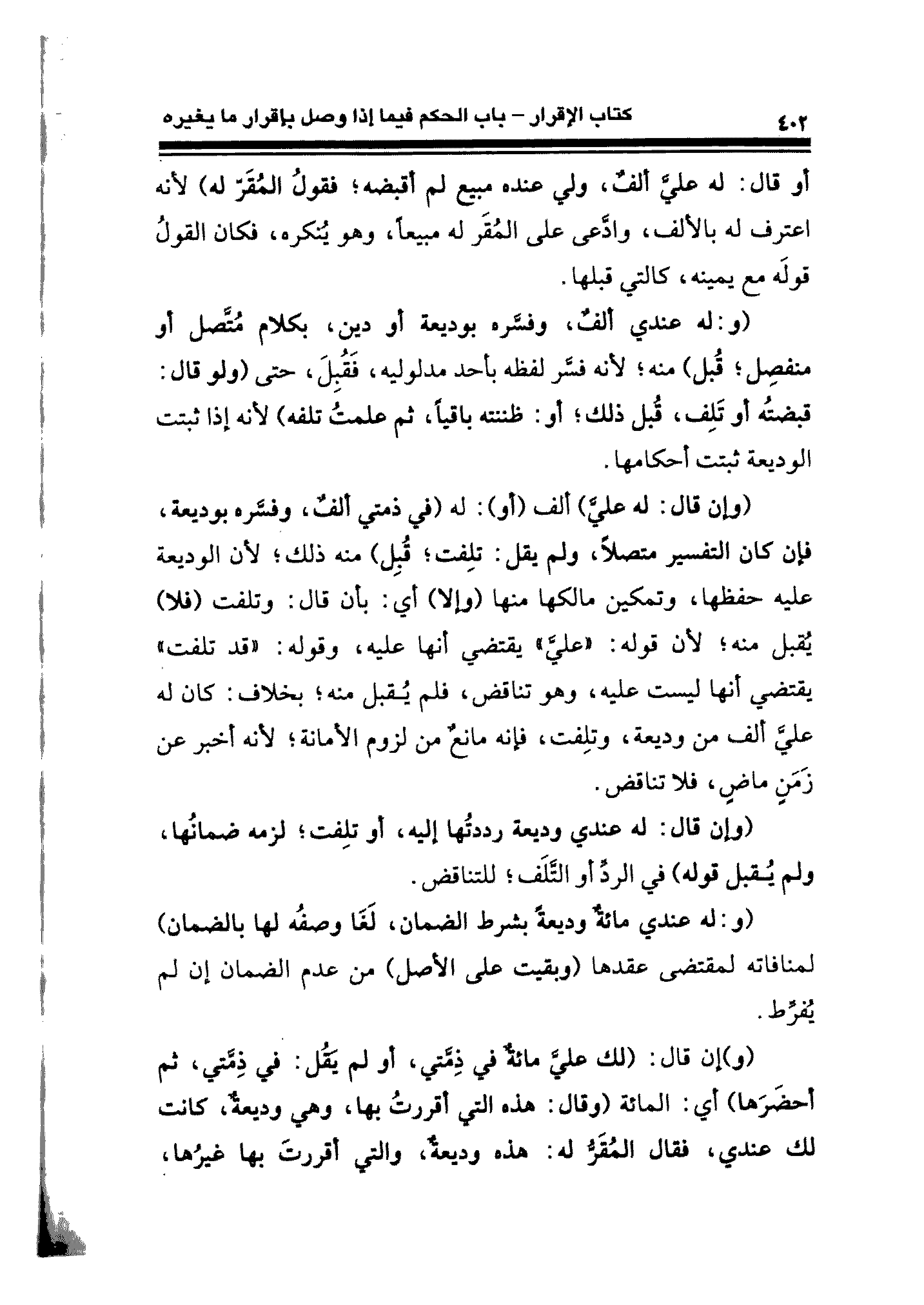 (وإن قال: له عليٍّ). ألف (أو): له (في ذمتي ألفٌ، وفسَّره بوديعة، فإن كان التفسير متصلًا، ولم يقل: تلِفت؛ قُبِل) منه ذلك؛ لأن الوديعة عليه حفظها، وتمكين مالكها عنها (وإلا) أي: بأن قال: وتلفت (فلا) يُقبل منه؛ لأن قوله: "عليٍّ" يقتضي أنها عليه، وقوله: "قد تلفت" يقتضي أنها ليست مليه، وهو تناقض، فلم يُقبل منه؛ بخلاف: كان له عليَّ ألف من وديعة، وتلِفت، فإنه مانعٌ من لزوم الأمانة؛ لأنه أخبر عن زَمَنٍ ماضٍ، فلا تناقض.