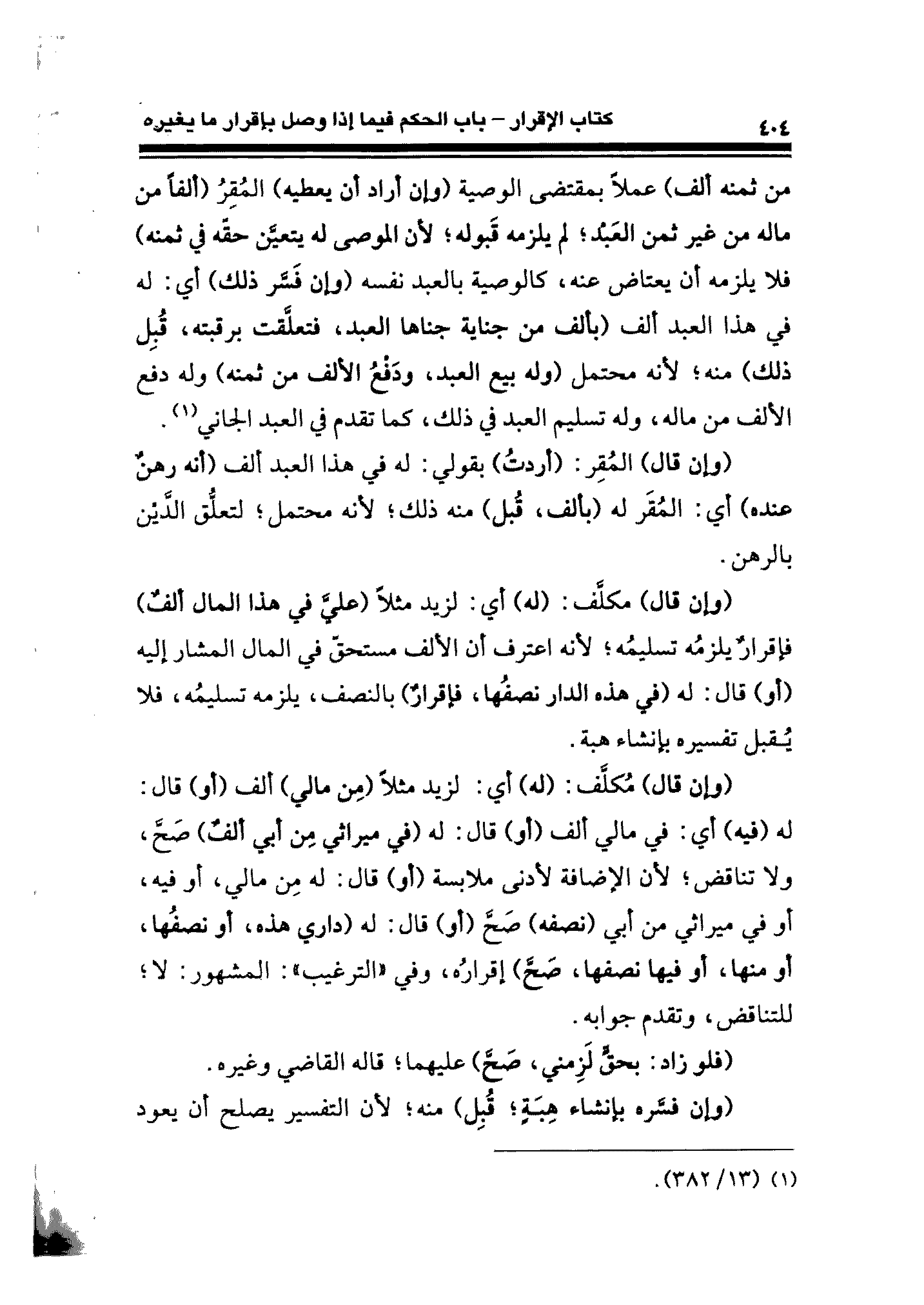 (وإن قال) مكلَّف: (له) أي: لزيد مثلًا (عليَّ في هذا المال ألفٌ) فإقرارٌ يلزمُه تسليمُه؛ لأنه اعترف أن الألف مستحقّ في المال المشار إليه (أو) قال: له (في هذه الدار نصفُها، فإقرارق) بالنصف، يلزمه تسليمُه، فلا يُقبل تفسيره بإنشاء هبة.