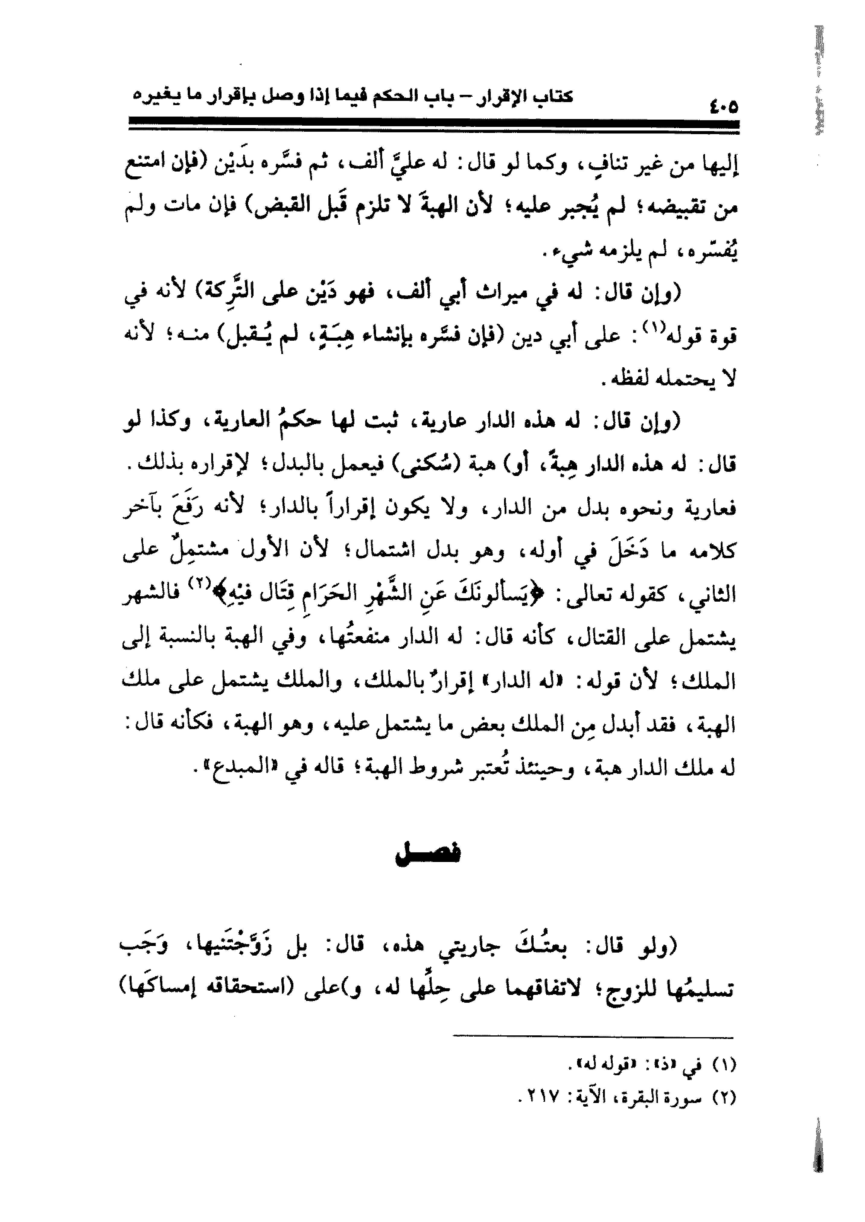 (وإن قال: له هذه الدار عارية، ثبت لها حكمُ العارية، وكذا لو قال: له هذه الدار هِبةً، أو) هبة (سُكنى) فيعمل بالبدل؛ لإقراره بذلك. فعارية ونحوه بدل من الدار، ولا يكون إقرارًا بالدار؛ لأنه رَفَعَ بآخر كلامه ما دَخَلَ في أوله، وهو بدل اشتمال؛ لأن الأول مشتمِلٌ على الثاني، كقوله تعالى: {يَسْأَلُونَكَ عَنِ الشَّهْرِ الْحَرَامِ قِتَالٍ فِيهِ} (¬٢) فالشهر يشتمل على القتال، كأنه قال: له الدار منفعتُها، وفي الهبة بالنسبة إلى الملك؛ لأن قوله: "له الدار" إقرارٌ بالملك، والملك يشتمل على ملك الهبة، فقد أبدل مِن الملك بعض ما يشتمل. عليه، وهو الهبة، فكأنه قال: له ملك الدار هبة، وحينئذ تُعتبر شروط الهبة؛ قاله في "المبدع".