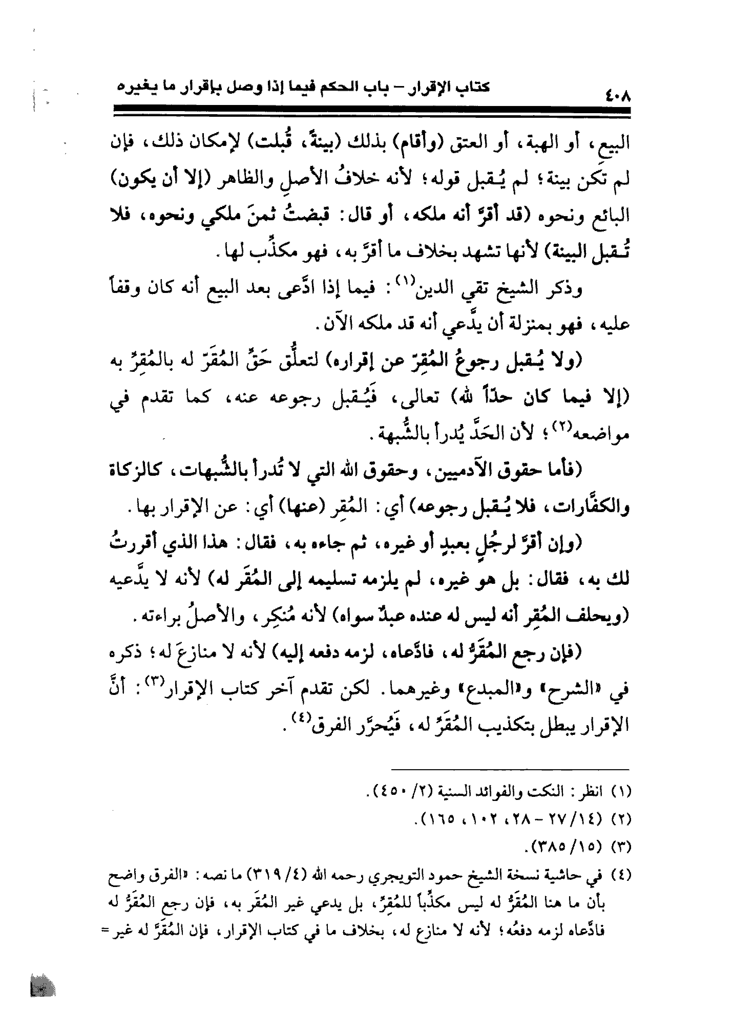 (¬٤) في حاشية نسخة الشيخ حمود التويجري رحمه الله (٤/ ٣١٩) ما نصه: "الفرق واضح بأن ما هنا المُقَرُّ له ليس مكذِّبًا للمُقِرِّ، بل يدعي غير المُقَر به فإن رجع المُقَرُّ له فادَّعاه لزمه دفعُه؛ لأنه لا منازع له، بخلاف ما في كتاب الإقرار، فإن المُقَرَّ له غير =