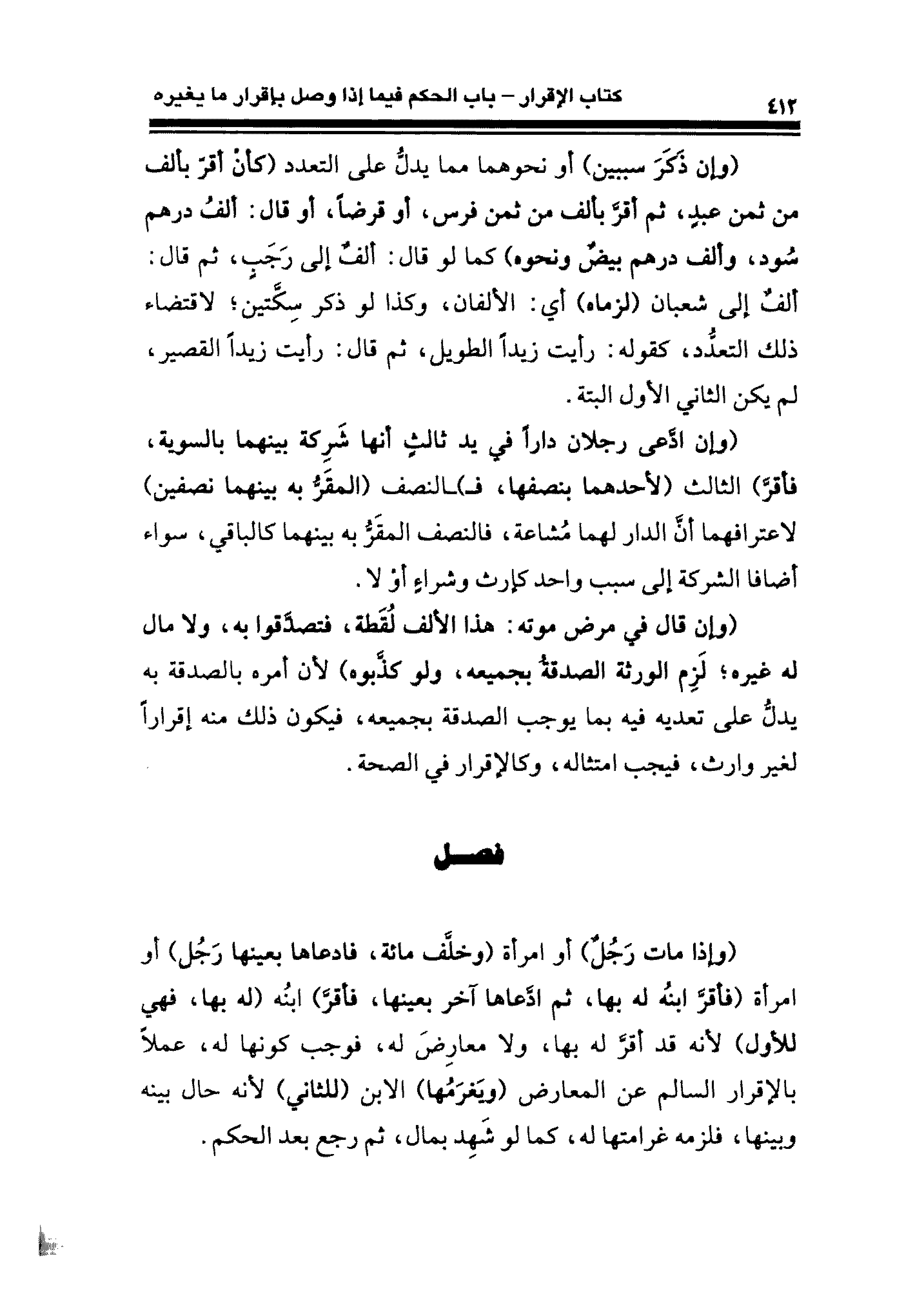 (وإن ادَّعى رجلان دارًا في يد ثالثٍ أنها شَرِكة بينهما بالسوية، فأقرَّ) الثالث (لأحدهما بنصفها، فـ) ـالنصف (المقَرُّ به بينهما نصفين) لاعترافهما أنَّ الدار لهما مُشاعة، فالنصف المقَرُّ به بينهما كالباقي، سواء أضافا الشركة إلى سبب واحد كإرث وشراءٍ أوْ لا.