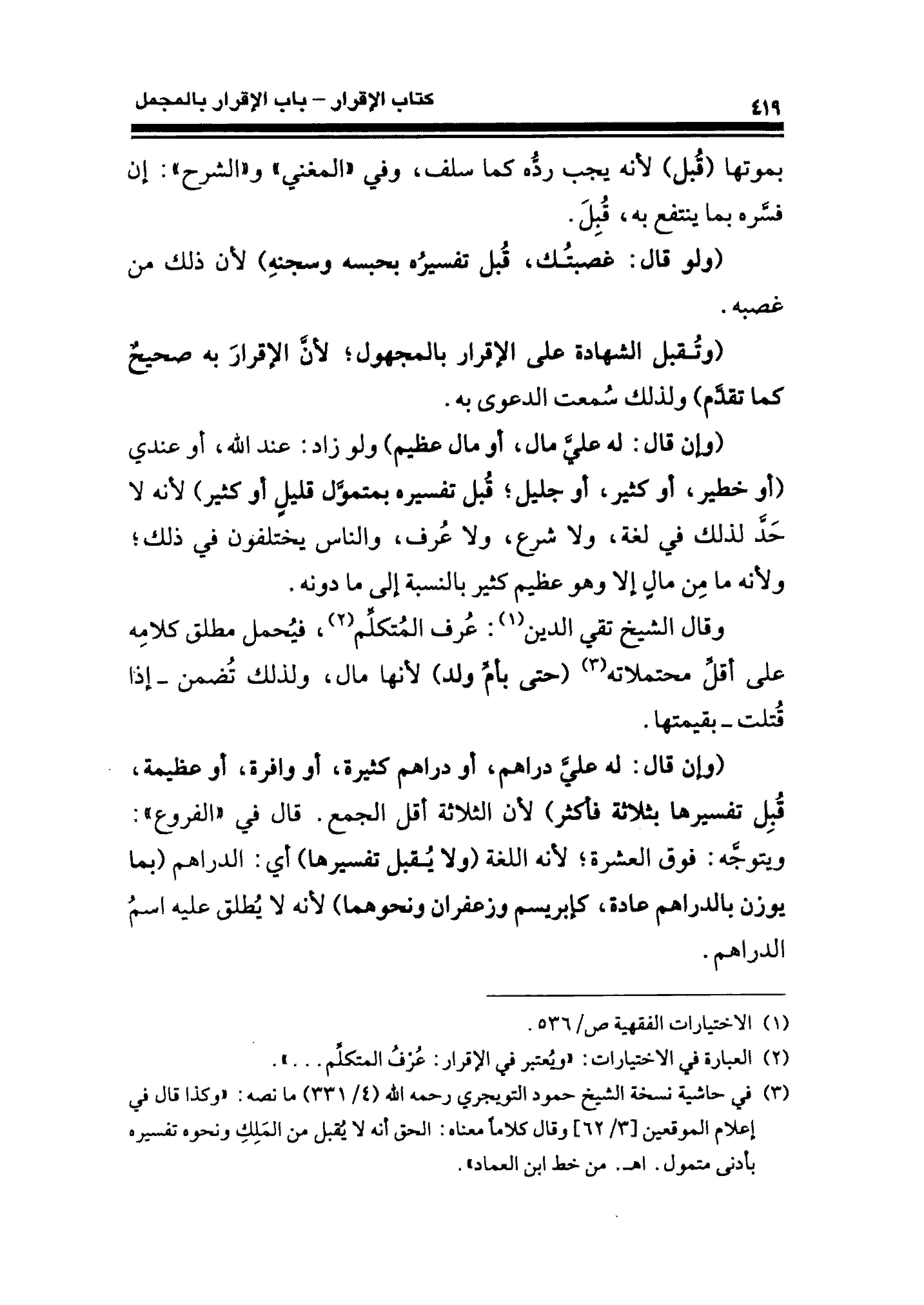 (¬٣) في حاشية نسخة الشيخ حمود التويجري رحمه الله (٤/ ٣٣١) ما نصه: "وكذا قال في إعلام الموقعين [٣/ ٦٢] وقال كلامًا معناه: الحق أنه لا يُقبل من المَلِكِ ونحوه تفسيره بأدنى متمول. اه. من خط ابن العماد".