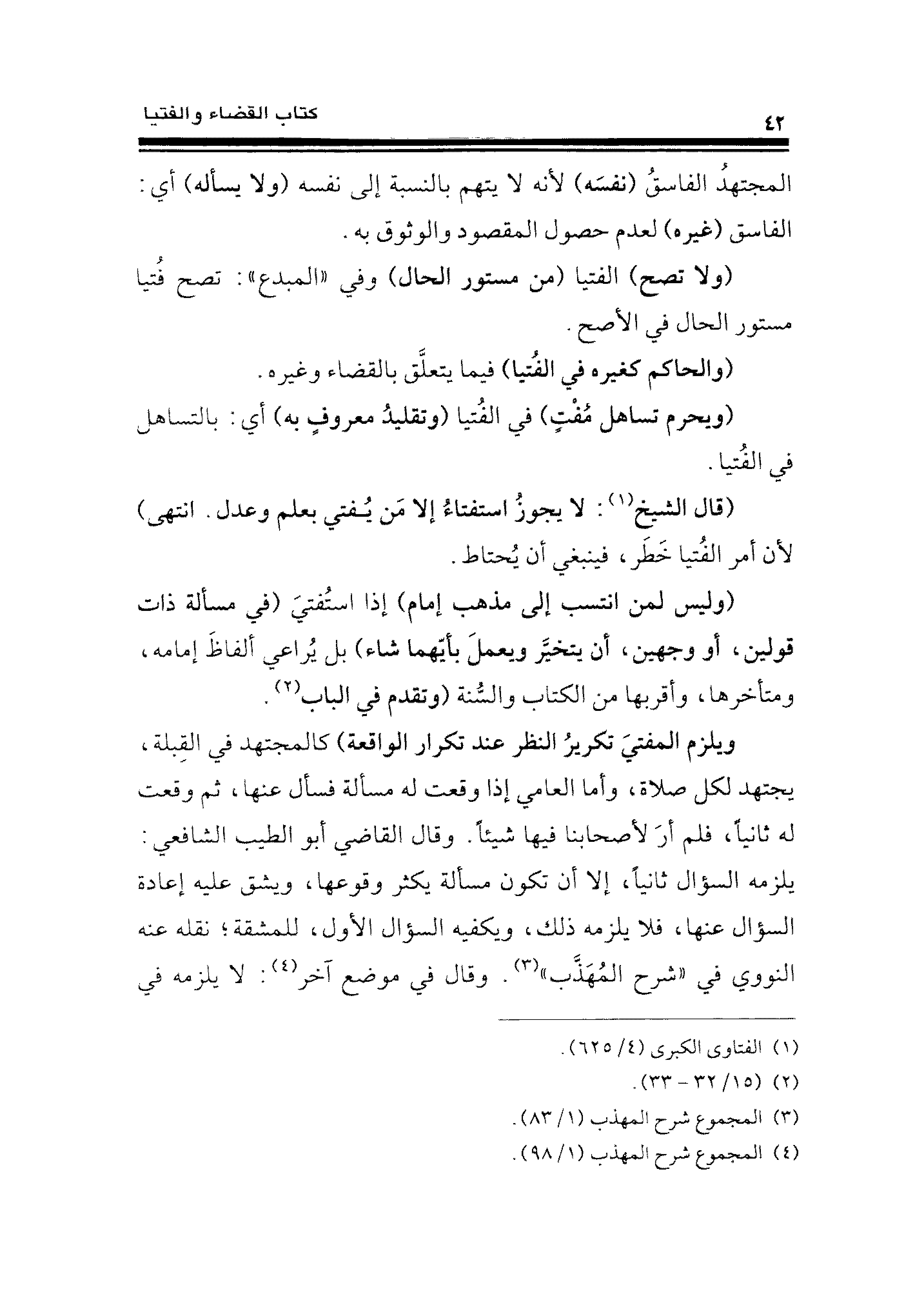 (وليس لمن انتسب إلى مذهب إمام) إذا استُفتيَ (في مسألة ذات قولين، أو وجهين، أن يتخيَّر ويعملَ بأيّهما شاء) بل يُراعي ألفاظَ إمامه، ومتأخرها، وأقربها من الكتاب والسُّنة (وتقدم في الباب (¬٢).