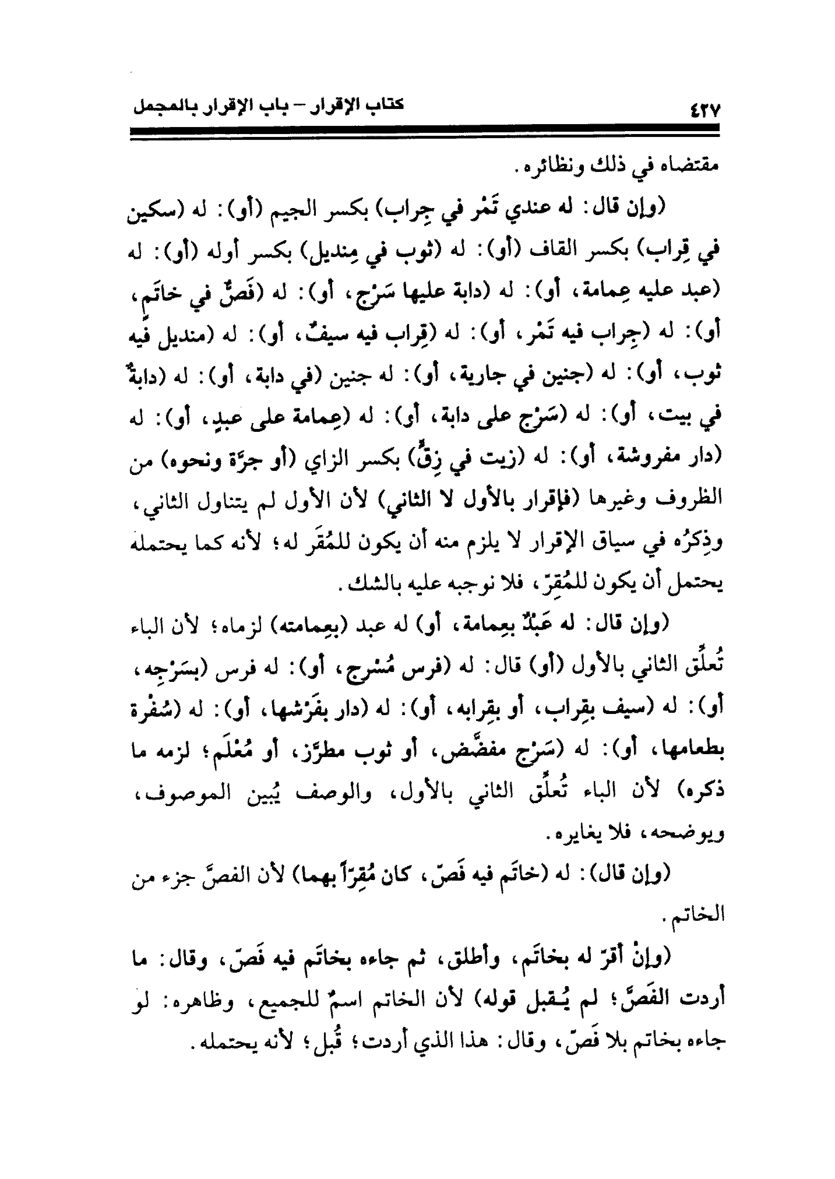 (وإن قال: له عندي تَمْر في جِراب) بكسر الجيم (أو): له (سكين في قِراب) بكسر القاف (أو): له (ثوب في مِنديل) بكسر أوله (أو): له (عبد عليه عِمامة، أو): له (دابة عليها سَرْج، أو): له (فَصٌّ في خاتَمٍ، أو): له (جِراب فيه تَمْر، أو): له (قِراب فيه سيفٌ، أو): له (منديل فيه ثوب، أو): له (جنين في جارية، أو): له جنين (في دابة، أو): له (دابةٌ في بيت، أو): له (سَرْج على دابة، أو): له (عِمامة على عبدٍ، أو): له (دار مفروشة، أو): له (زيت في زِقٍّ) بكسر الزاي (أو جرَّة ونحوه) من الظروف وغيرها (فإقرار بالأول لا الثاني) لأن الأول لم يتناول الثاني، وذِكرُه في سياق الإقرار لا يلزم منه أن يكون للمُقَر له؛ لأنه كما يحتمله يحتمل أن يكون للمُقِرِّ، فلا نوجبه عليه بالشك.