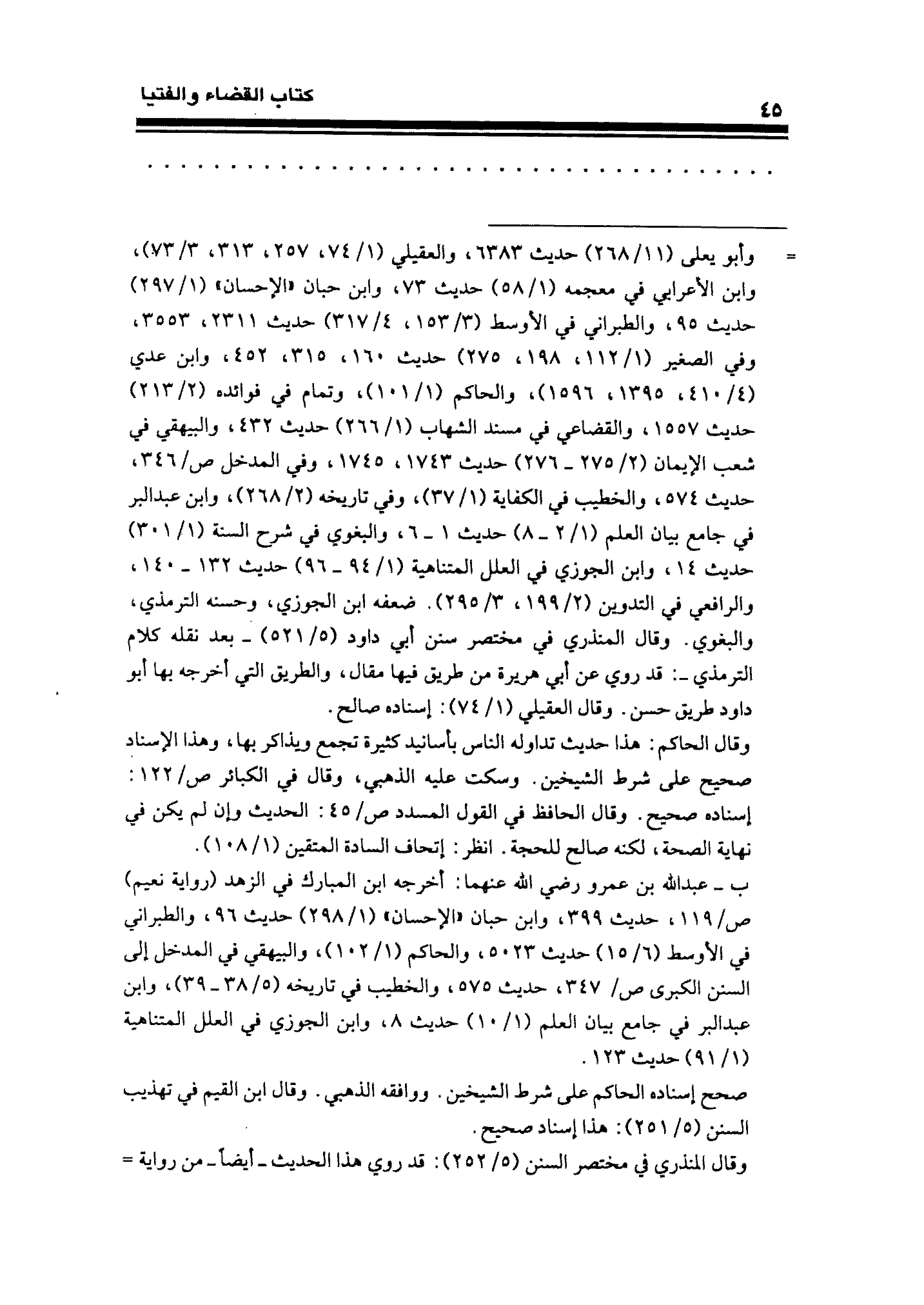 ب - عبد الله بن عمرو رضي الله عنهما: أخرجه ابن المبارك في الزهد (رواية نعيم) ص/ ١١٩، حديث ٣٩٩، وابن حبان "الإحسان" (١/ ٢٩٨) حديث ٩٦، والطبراني في الأوسط (٦/ ١٥) حديث ٥٠٢٣، والحاكم (١/ ١٠٢)، والبيهقي في المدخل إلى السنن الكبرى، ص/ ٣٤٧، حديث ٥٧٥، والخطيب في تاريخه (٥/ ٣٨ - ٣٩)، وابن عبد البر في جامع بيان العلم (١/ ١٠) حديث ٨، وابن الجوزي في العلل المتناهية (١/ ٩١) حديث ١٢٣.