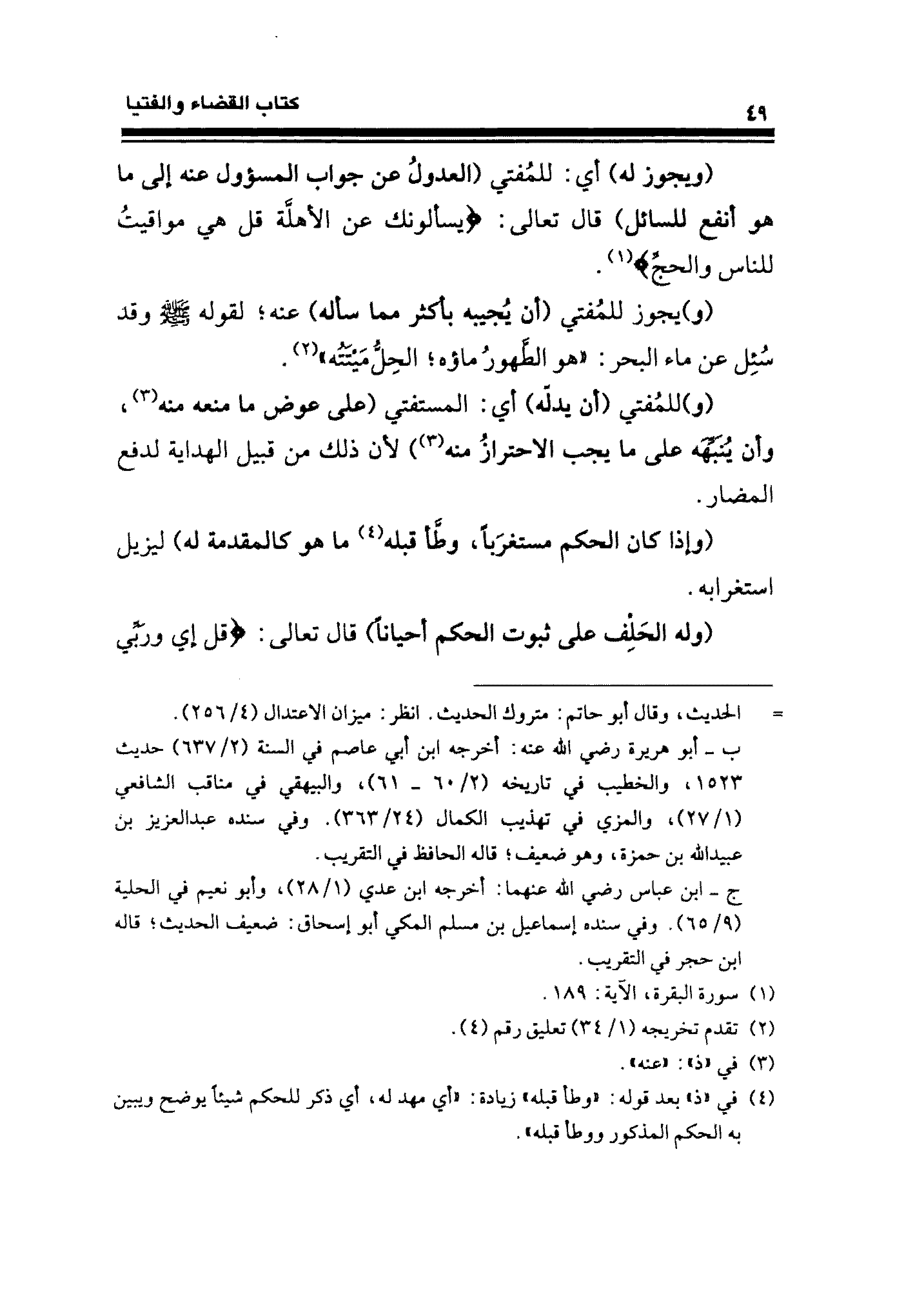 (و) يجوز للمُفتي (أن يُجيبه بأكثر مما سأله) عنه؛ لقوله - صلى الله عليه وسلم - وقد سُئِل عن ماء البحر: "هو الطَّهورُ ماؤه؛ الحِلُّ مَيْتَتُه" (¬٢).
