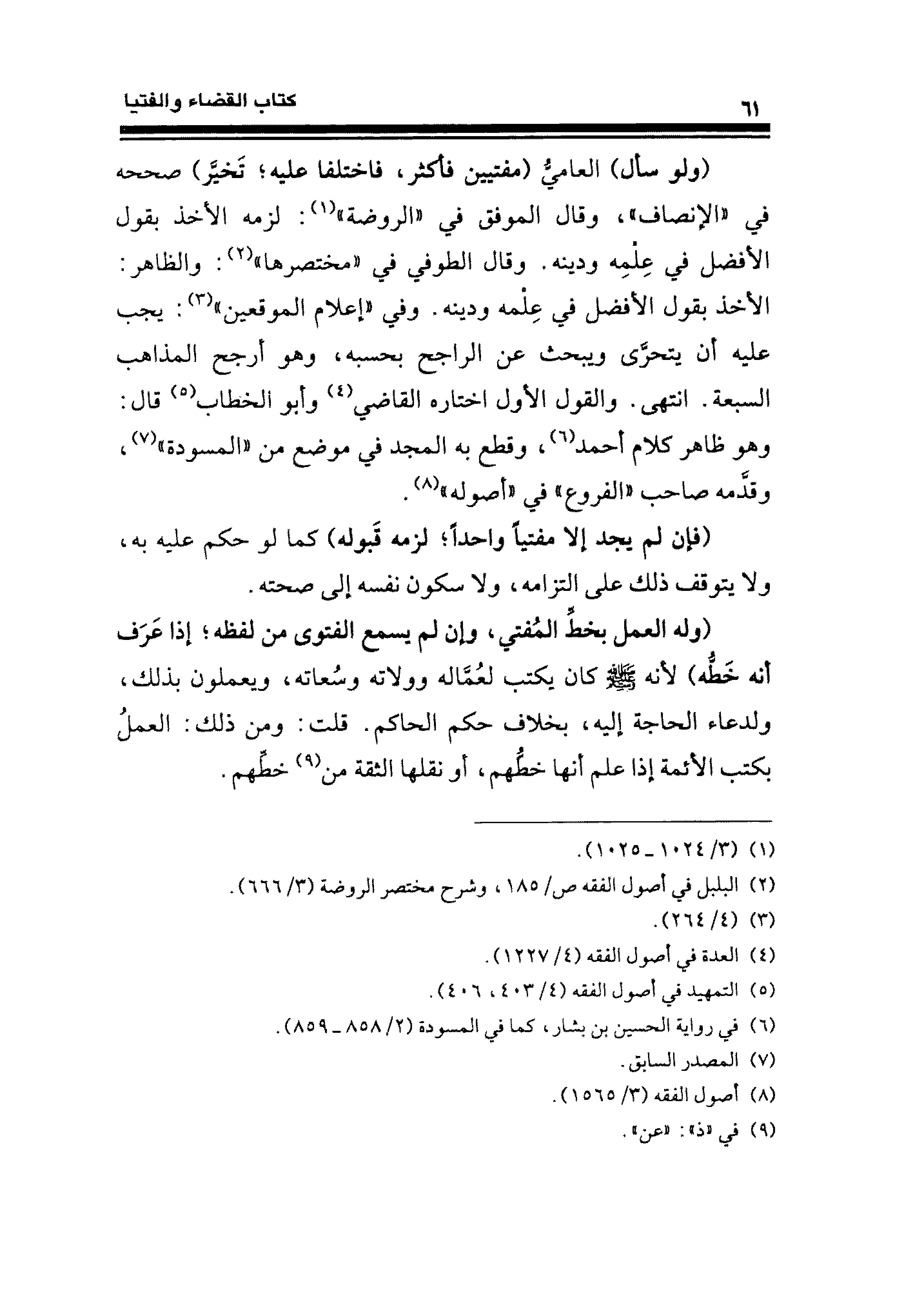 (ولو سأل) العاميُّ (مفتيين فأكثر، فاختلفا عليه؛ تَخيَّر) صححه في "الإنصاف"، وقال الموفق في "الروضة" (¬١): لزمه الأخذ بقول الأفضل في عِلْمِه ودينه. وقال الطوفي في "مختصرها" (¬٢): والظاهر: الأخذ بقول الأفضل في عِلْمه ودينه. وفي "إعلام الموقعين" (¬٣): يجب عليه أن يتحرَّى ويبحث عن الراجح بحسبه، وهو أرجح المذاهب السبعة. انتهى. والقول الأول اختاره القاضي (¬٤) وأبو الخطاب (¬٥) قال: وهو ظاهر كلام أحمد (¬٦)، وقطع به المجد في موضع من "المسودة" (¬٧)، وقدَّمه صاحب "الفروع" في "أصوله" (¬٨).